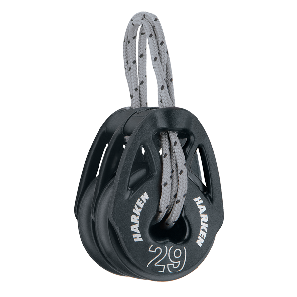 T2ª blocks come in single and double configurations and can be tied, spliced, or lashed to almost anything. T2 doubles feature composite line guides that are integrated into the block head. They prevent the block from capsizing by pushing the lashing line to the outer edges of the sideplates. The 29, 40, and 57 mm blocks feature composite sheaves that spin freely on Delrin¨ ball bearings with curved bearing races. They have no metal shackles or rivets, making them the lightest soft-attach blocks Harken has ever designed.