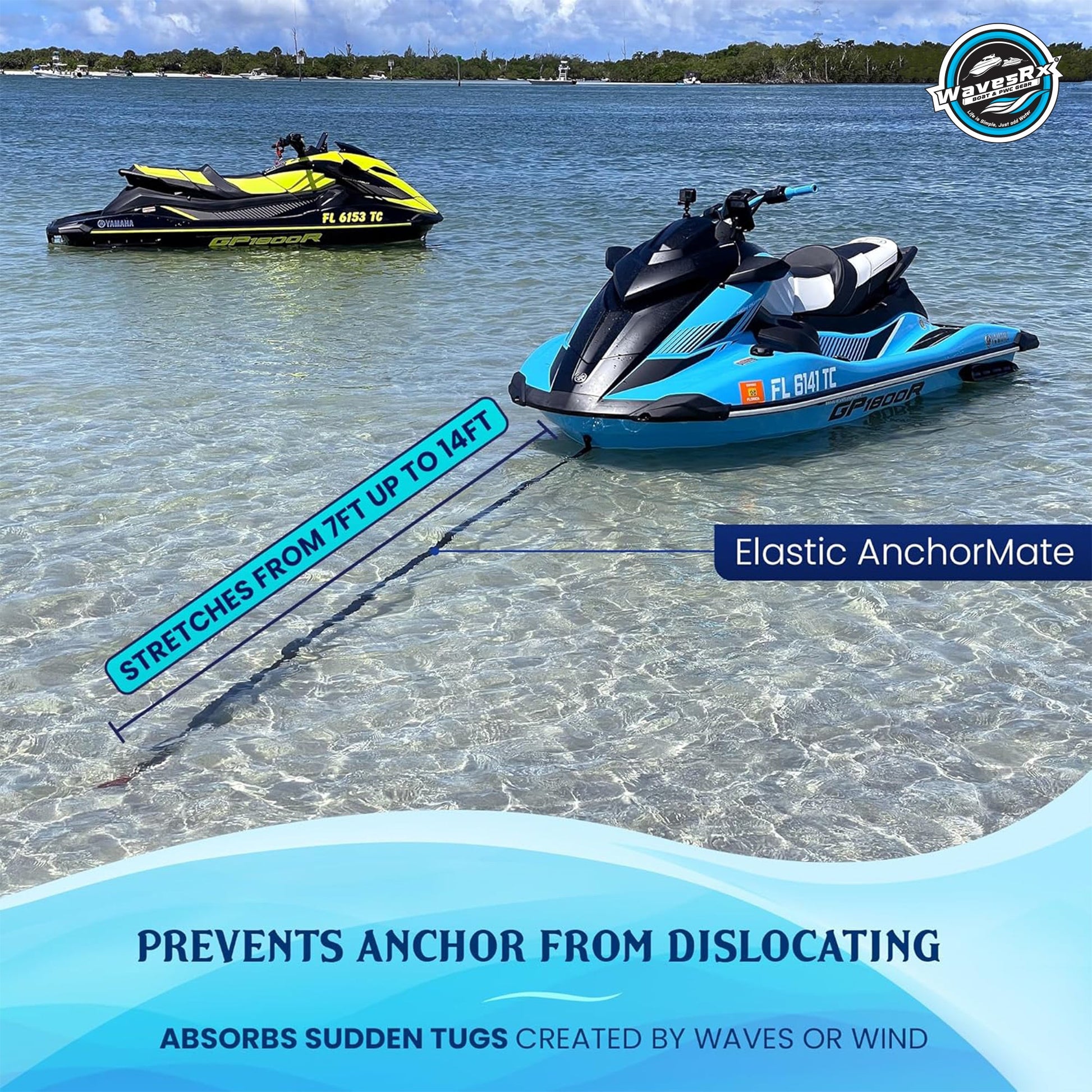 AnchorMate Flat Bungee Line Allows You to Safely Anchor Your Jet Ski Near Beach or Sandbar. Elastic Rope Stretches from 7' up to 14' to Absorb Wake Tugs and Wind Gusts. Comes With 2 Heavy-Duty Stainless Steel Hooks and a Ventilated Storage Bag.