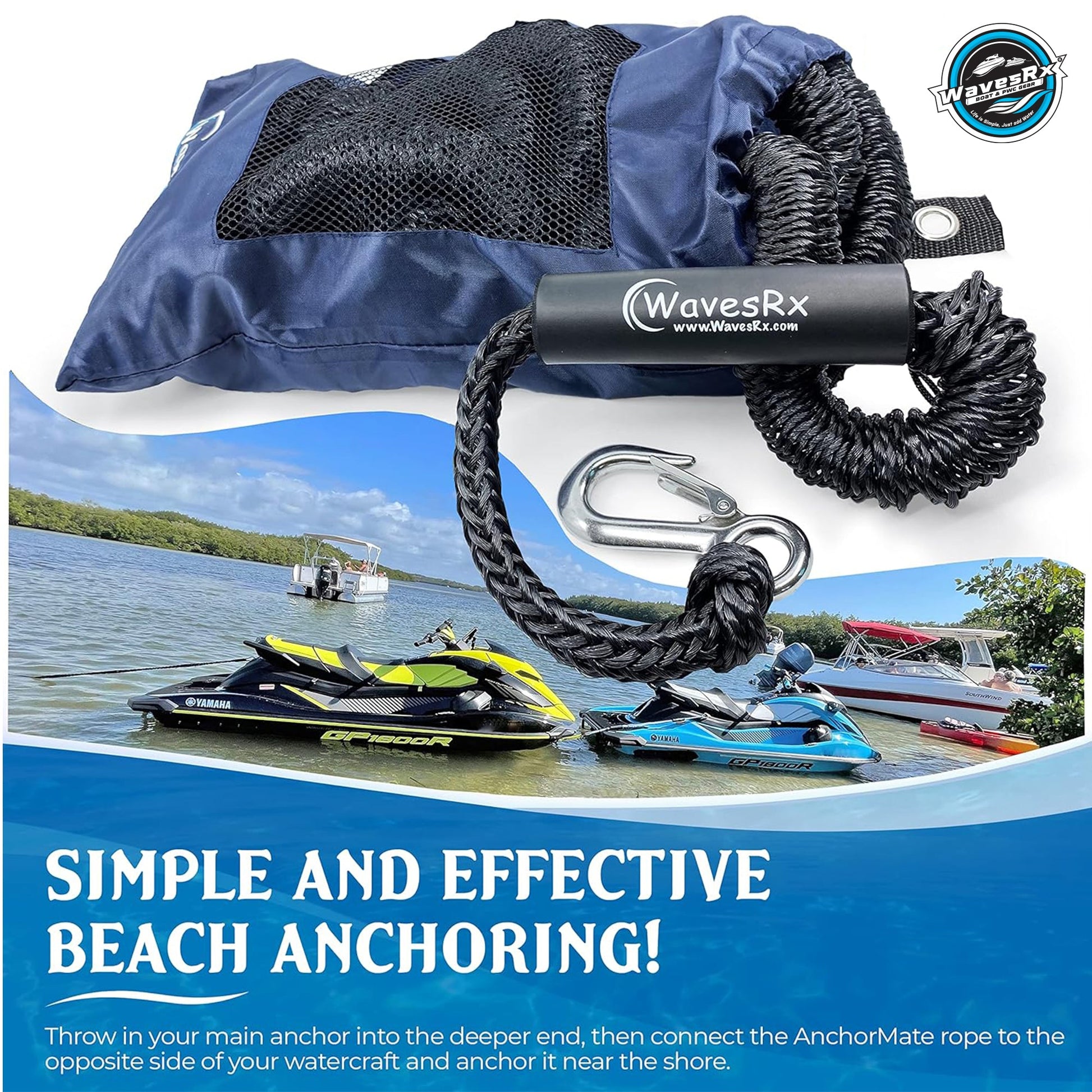 - SIMPLE AND EFFECTIVE BEACH ANCHORING! - You found this picture perfect secluded beach with no dock - time to open up your WavesRx Accessories bag. Throw in the main anchor into the deeper end and make sure it’s grabbing, then connect the AnchorMate rope to the opposite side of your watercraft and anchor it near the shore. Time to relax and enjoy your new private beach!