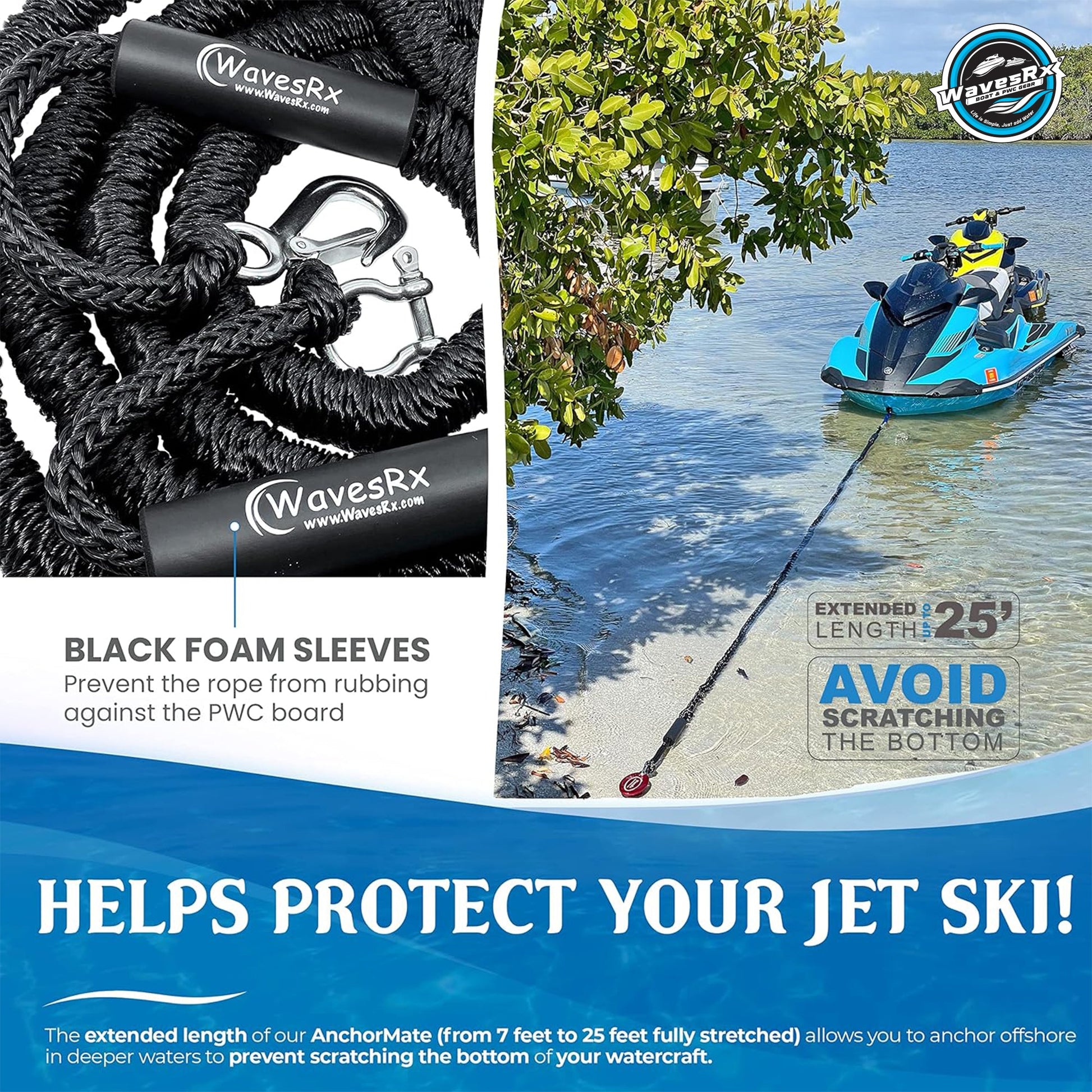 - HELPS PROTECT YOUR JET SKI! - The extended length of our AnchorMate (from 7 feet to 25 feet fully stretched) allows you to anchor offshore in deeper waters to prevent scratching the bottom of your watercraft. The foam sleeves help prevent the rope from rubbing against the PWC surfaces. It comes in a ventilated heavy duty Storage Bag, to easily stow away when not in use. Inludes Marine Grade Stainless Steel Snap Hook and D Ring ensuing a quck and secure connection.