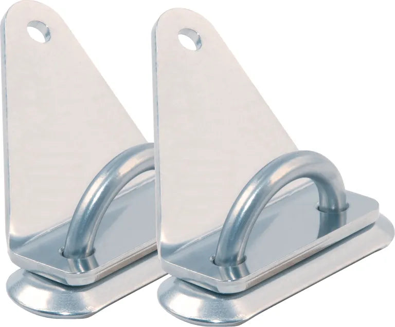 This pair of Allen U-Bolts with lowers and bottom backing plates is designed with a 6mm rod and 22mm internal width, shaped like the letter "U" with threaded ends. These bolts are ideal for use on boats, providing a secure attachment point for lines, hardware, and rigging. Each pair includes two U-Bolts, four nuts, two backing plates for the underside of the deck, and two lower shroud attachment plates, all made from marine-grade stainless steel.