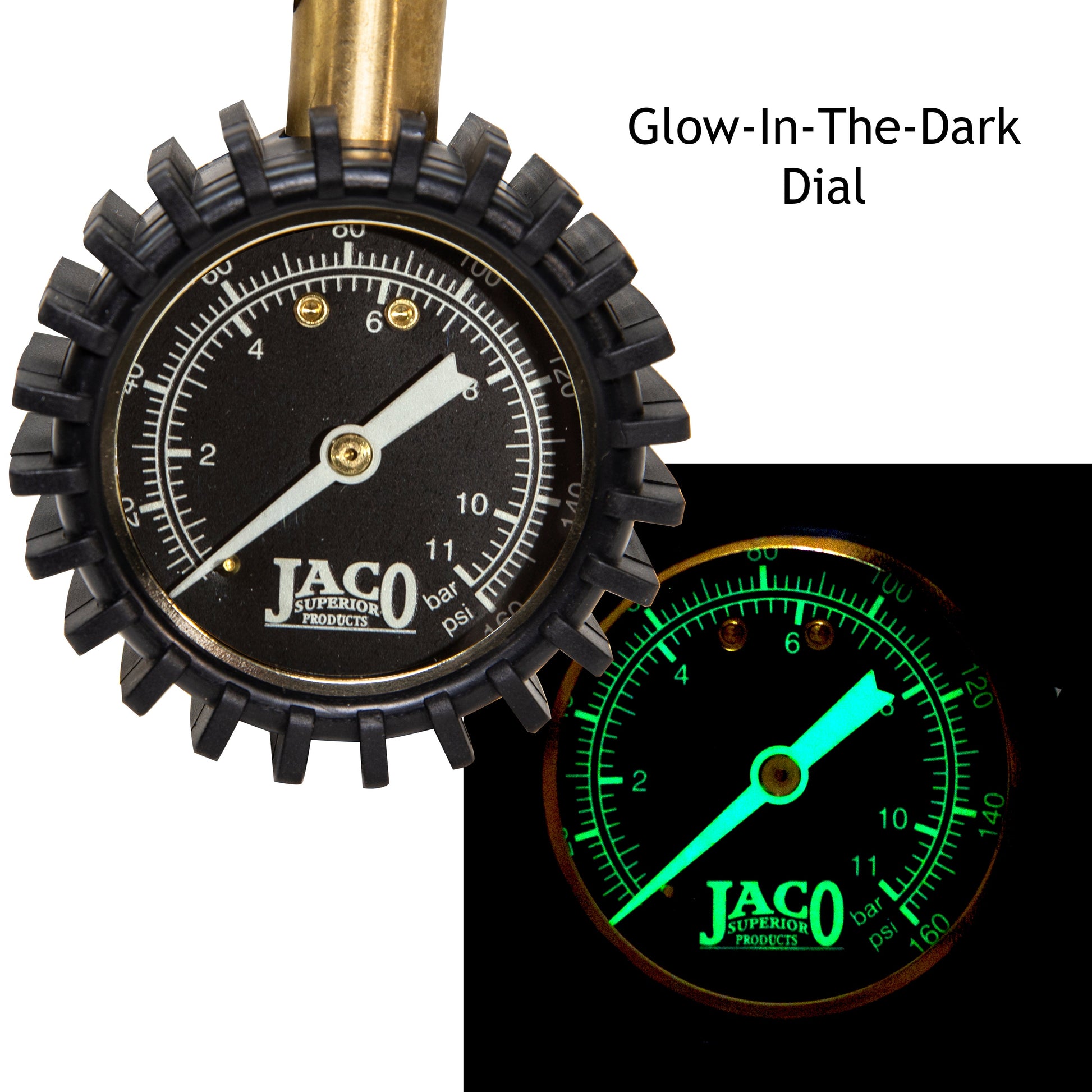 - Larger, 2" glow-in-dark dial features easy-to-read dual measurement scale 0-160 PSI / 0-7 BAR, providing accurate readings that "lock" in place until the pressure reset button on the neck is pushed