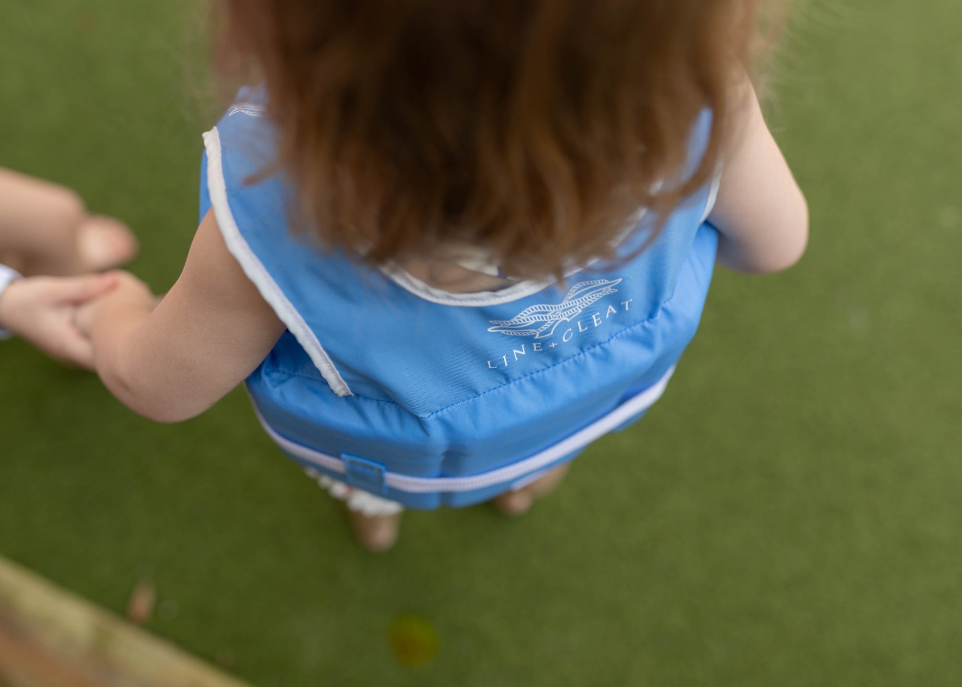 The Skiff can ONLY be put on with the child’s arms through the arm holes and always secure the between the legs strap to reduce the risk of serious injury or death.