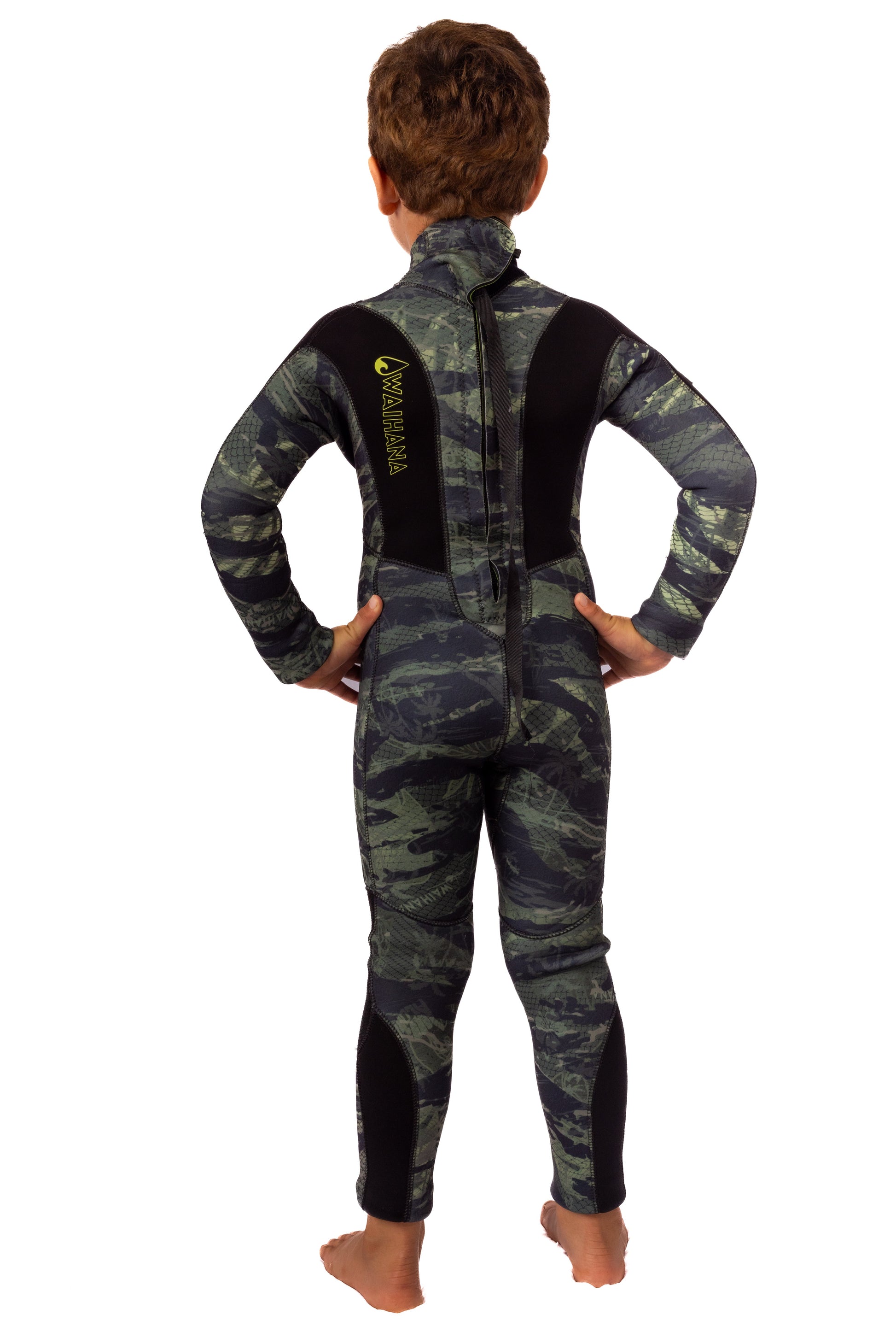 Introducing the Waihana Children's Wetsuit. This 2mm steamer offers extra warmth and maximum comfort, allowing your little adventurer to move with ease. With durable knee pads and a reliable YKK back zip, this suit is perfect for splashing, diving, and riding the waves. Crafted in our popular Tropicam or Lime Fishbone patterns, it's a must-have for all young explorers.