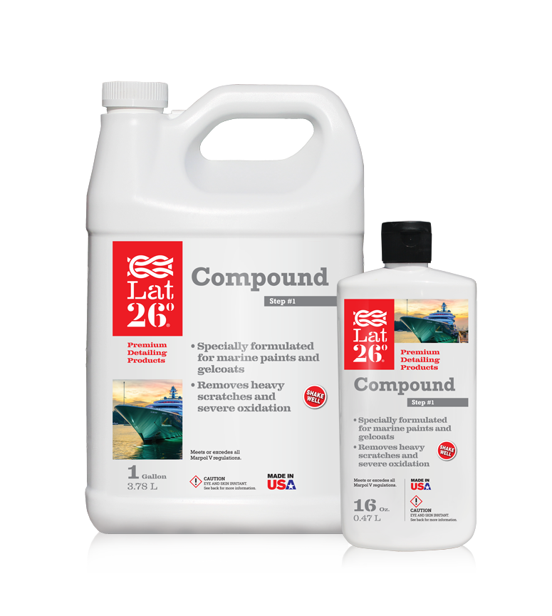 Lat 26 Degrees Compound #1 for boats and yachts removes heavily oxidized and damaged surfaces on paint and gelcoat. It can also be used to remove 1500 grit sanding scratches. Uniform compounding beads break down while polishing to reduce swirl marks and micro scratches. Follow with Medium Compound #2 and Fine Polish #3 to restore surface to like new condition