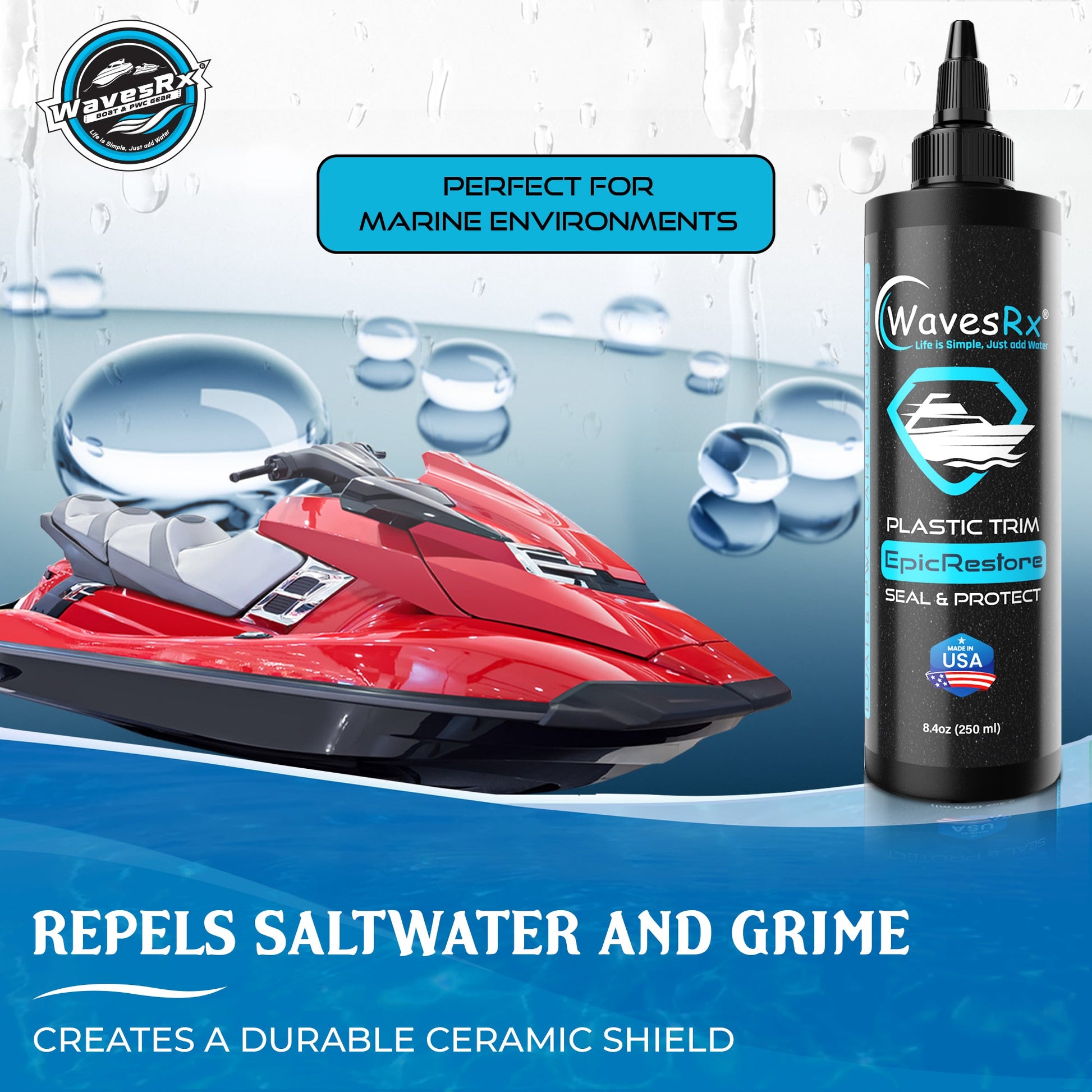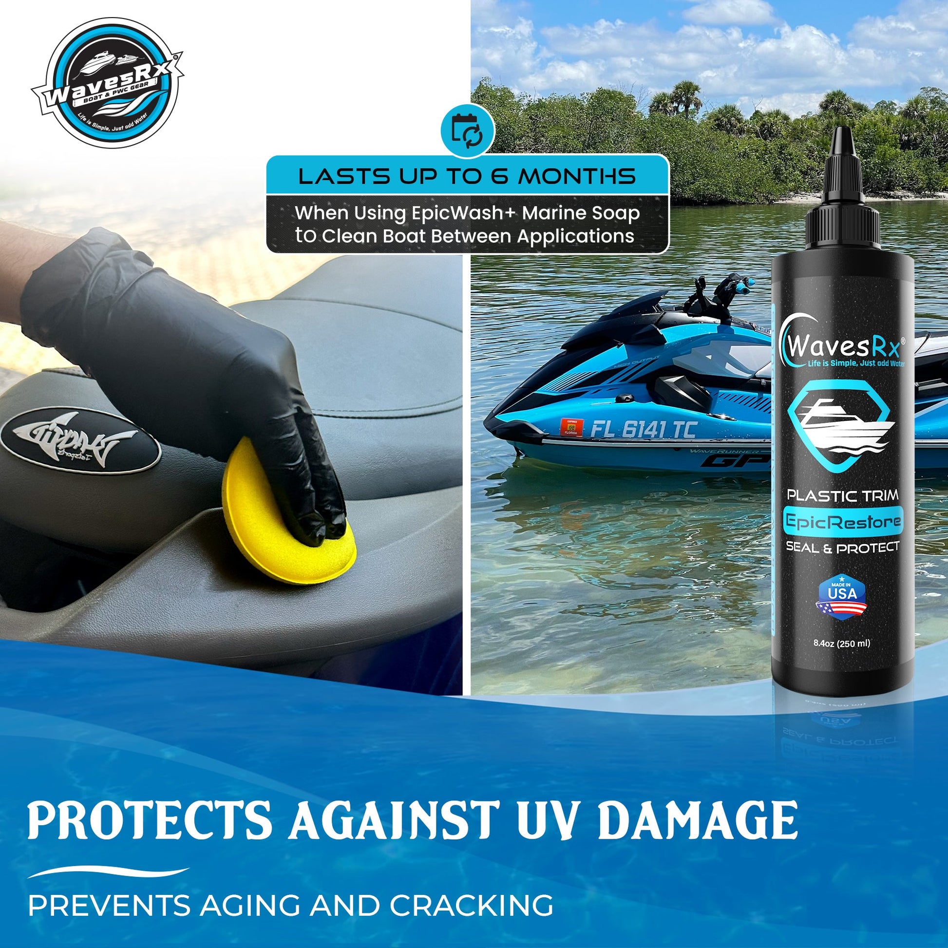 REPELS SALTWATER AND GRIME: EpicRestore creates a durable shield against saltwater and grime. It serves as both a plastic restorer and a plastic shine enhancer, keeping your boat’s trim clean and protected for up to 6 months. Ideal for boats and PWCs, this protectant ensures your watercraft stays clean and protected even in the harshest marine environments.