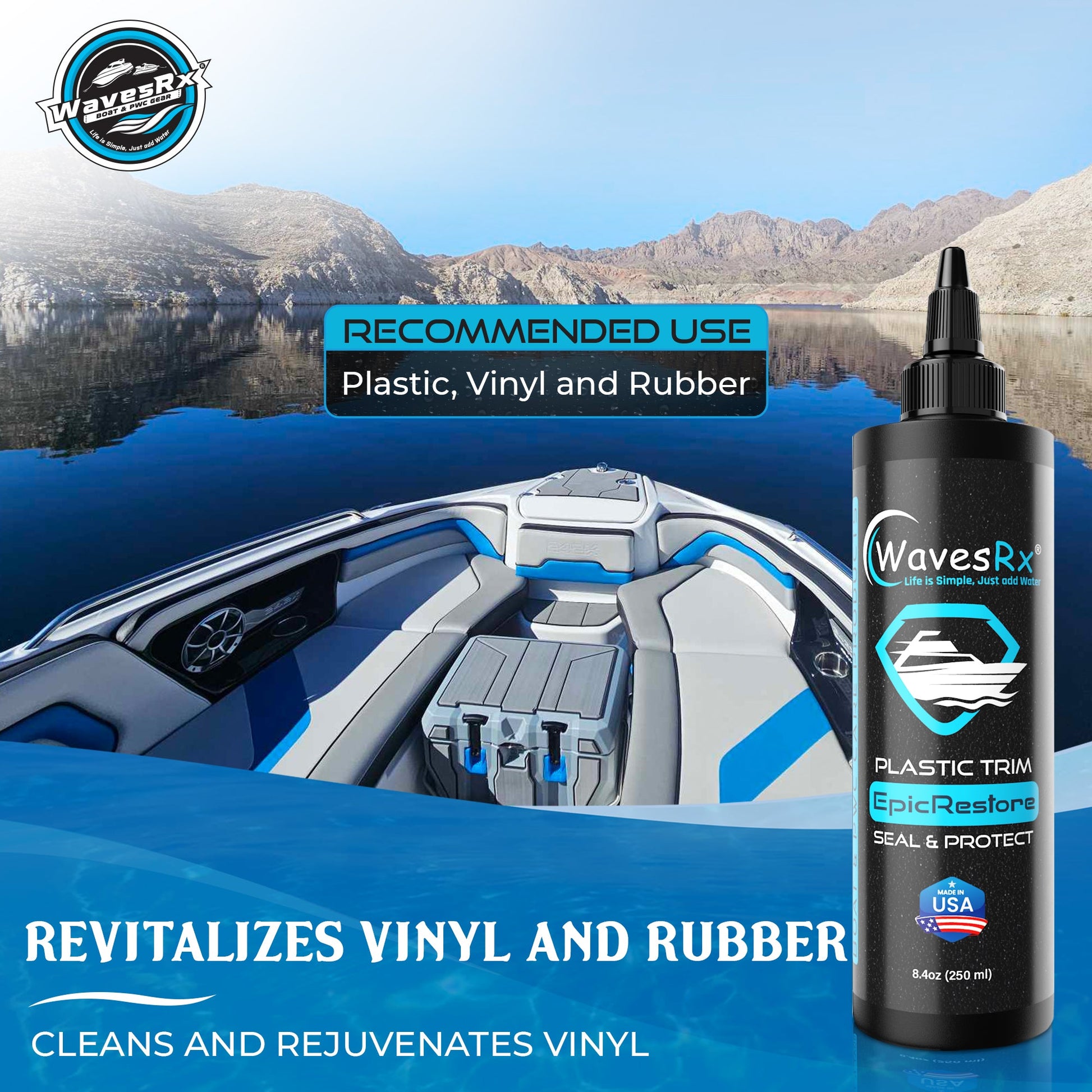 REVITALIZES VINYL AND RUBBER: EpicRestore enhances plastic and vinyl surfaces. Use it as a black trim restorer or vinyl cleaner to rejuvenate your boat’s trim while sealing out salt, dirt, and grime. This marine-grade protectant seals and revitalizes the appearance of your boat’s plastic trim and vinyl.
