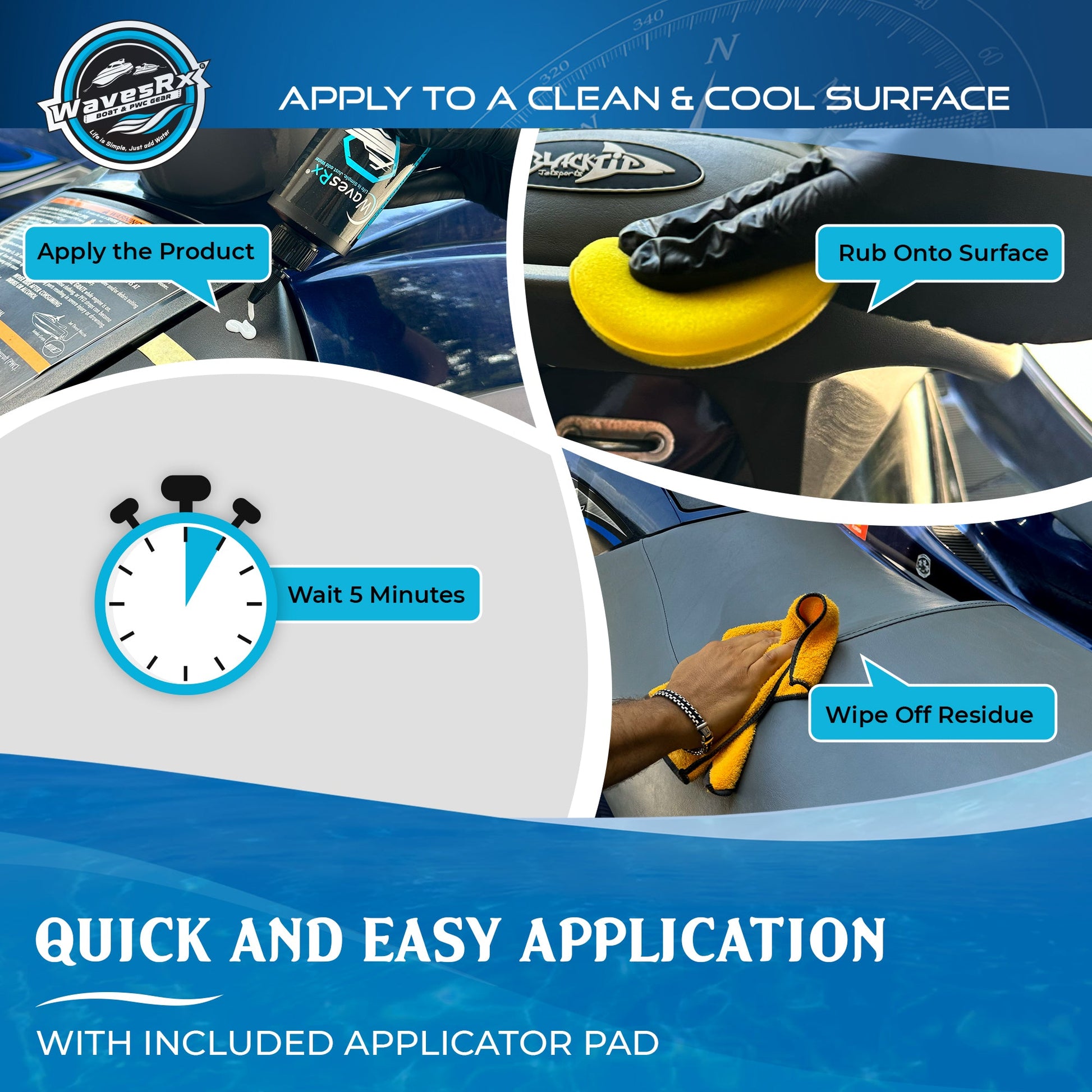 QUICK AND EASY APPLICATION: Simply clean and dry the surface, apply a small amount to a cool surface using the included applicator sponge, let it ‘sit’ for 5 minutes, then wipe off any residue. No complex steps—just simple and efficient care for your boat’s plastic and vinyl surfaces. Proudly made in Florida, USA.