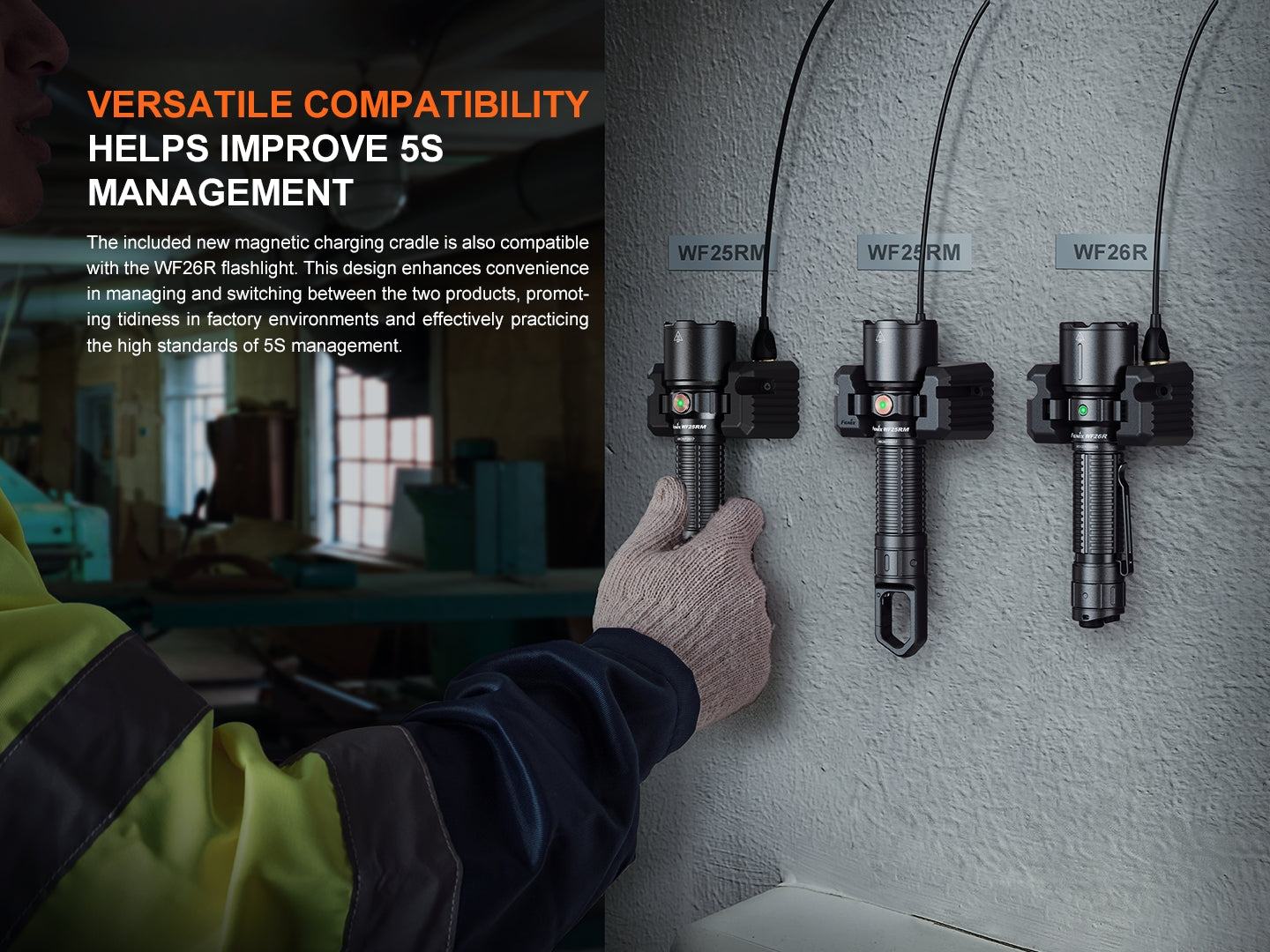 The WF25RM comes with a secure snap-in charging cradle which is also compatible with the Fenix WF26R flashlight (sold separately), making these two lights a perfect setup for industrial teams. You can charge the light either in the cradle or on-the-go with the included magnetic charging cable.