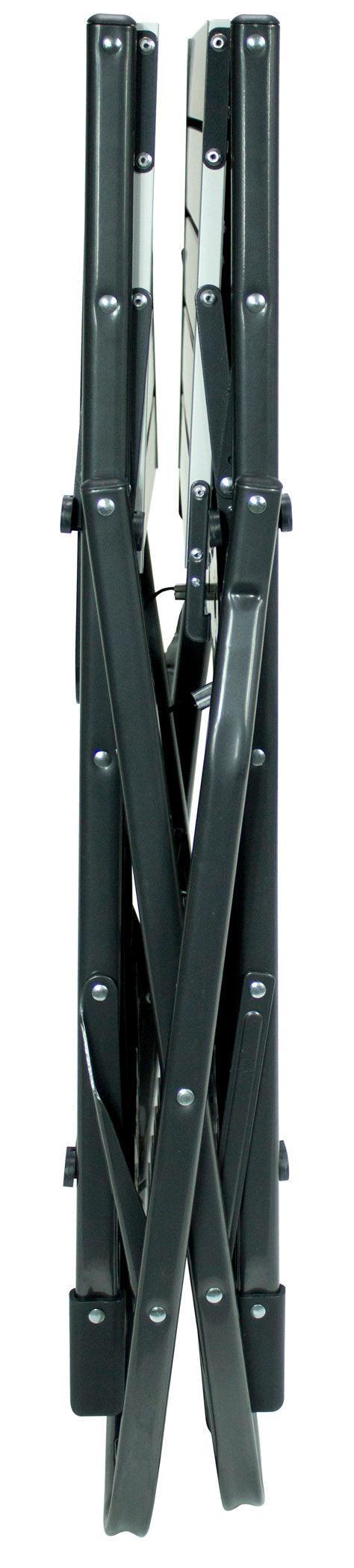 One-piece powder-coated steel frame unfolds easily to reveal an aluminum counter top, storage rack, and four plastic fold-out side tables.