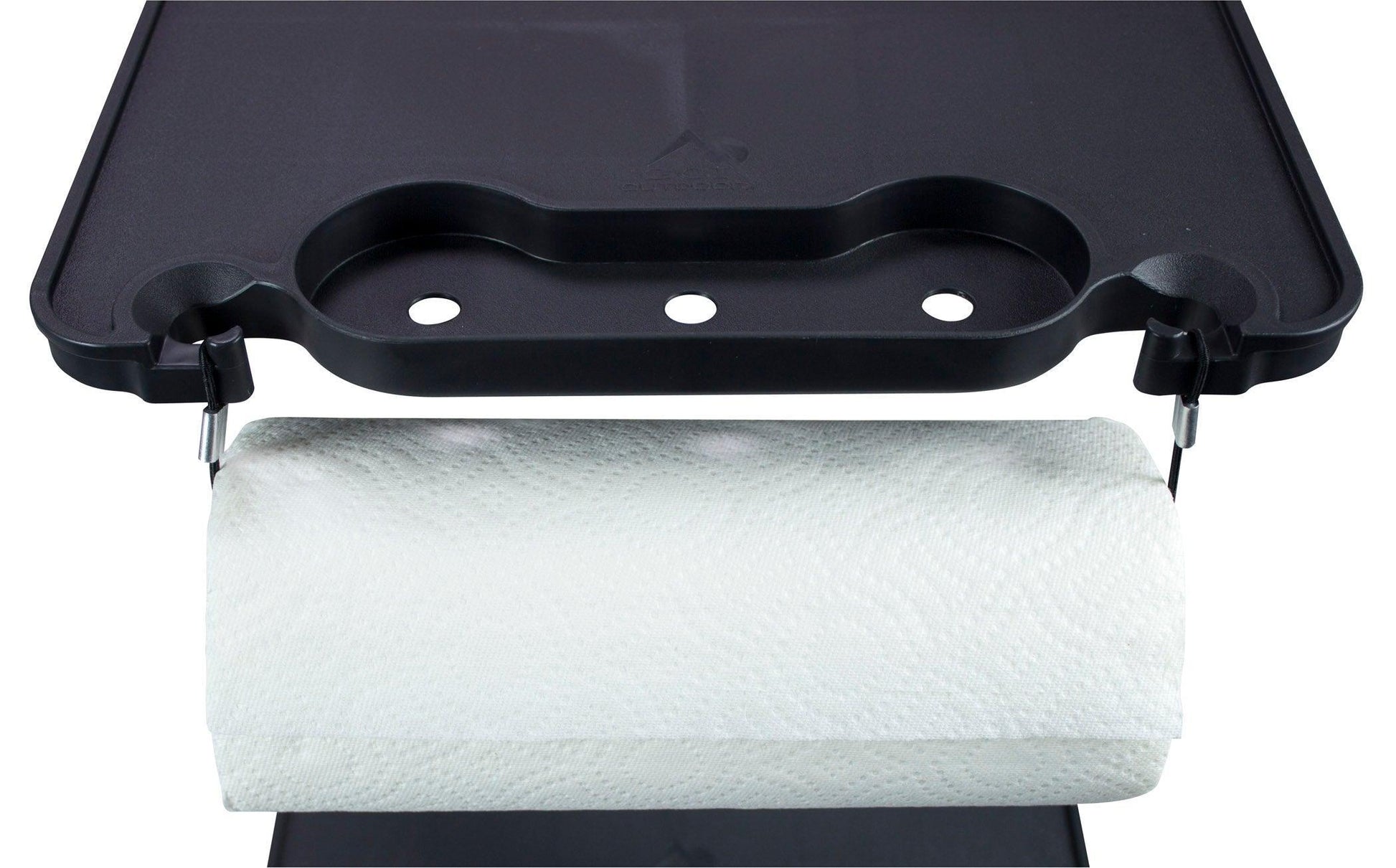 Heat-resistant aluminum counter top (weight limit 48 lbs.) is the ideal space for a camp stove; lower rack (weight limit 35 lbs.) for dry good storage.