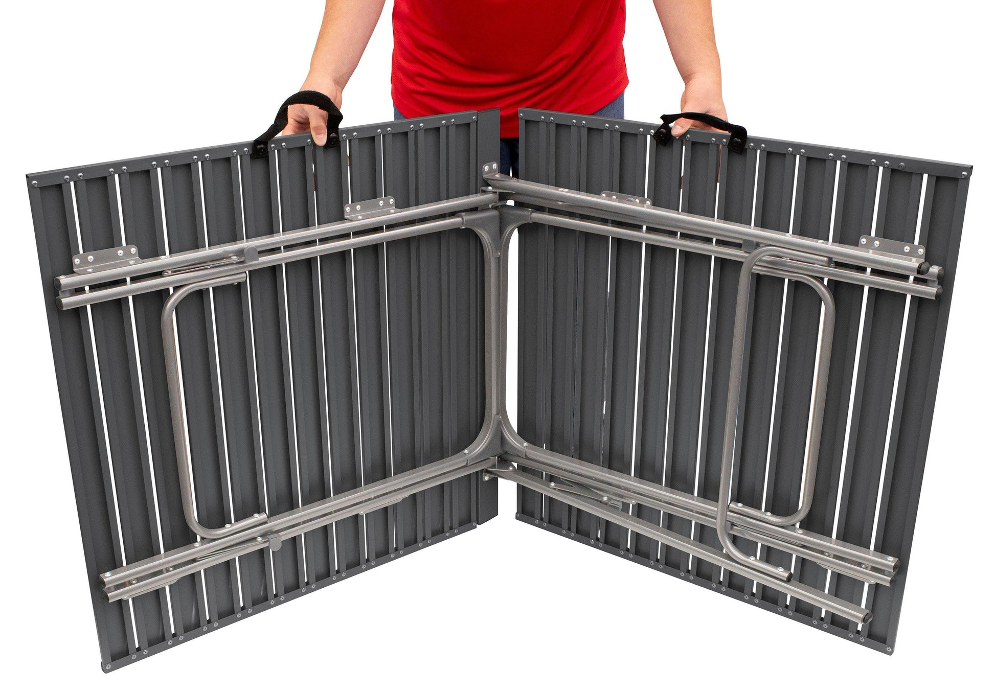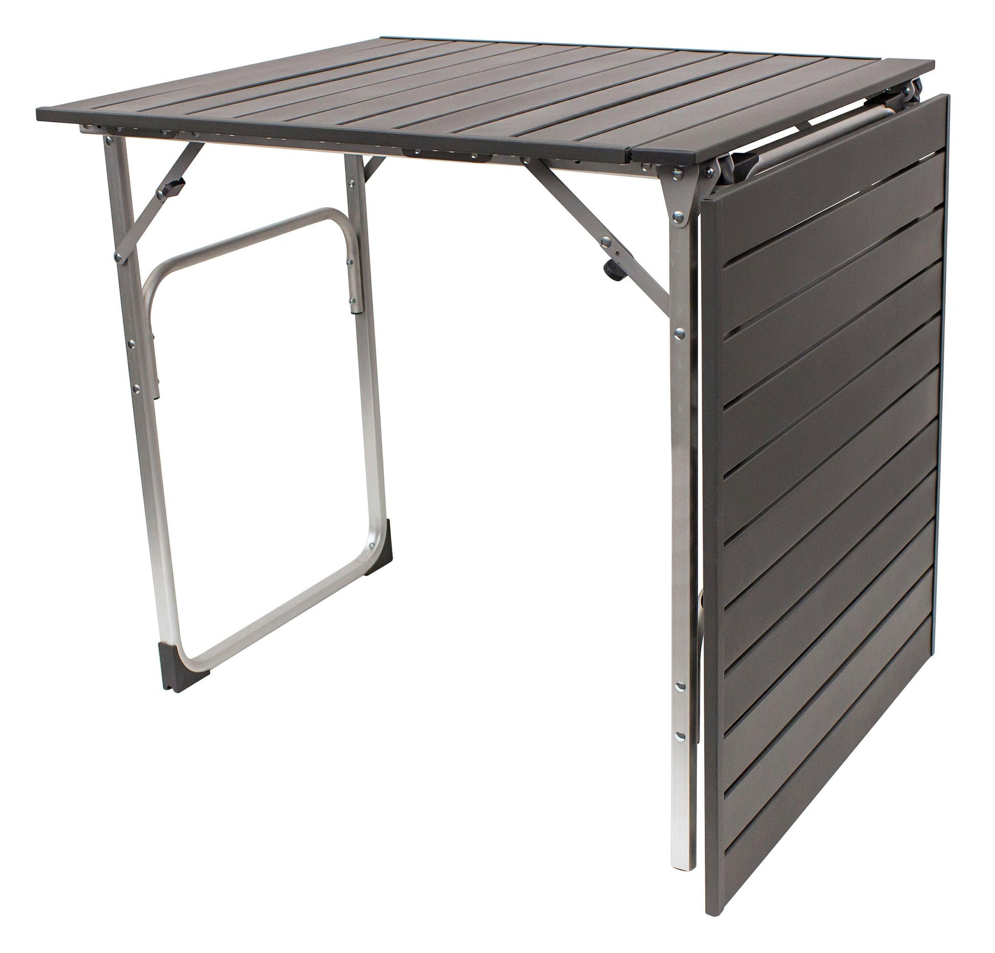 Quality Construction: Equipped with Slim-Fold Technology, this outdoor table quickly and easily unfolds to reveal a heat-resistant aluminum countertop and folds flat for enhanced portability when not in use.