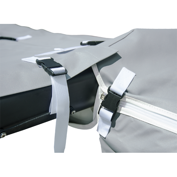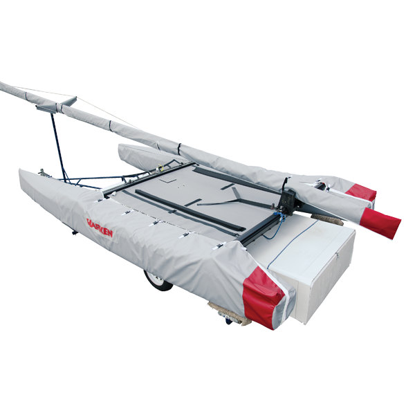 Separate sailboat covers of durable Top Gun fabric for each hull, with mesh on bottom for drainage. Secures with zipper and buckles for easy on/off.