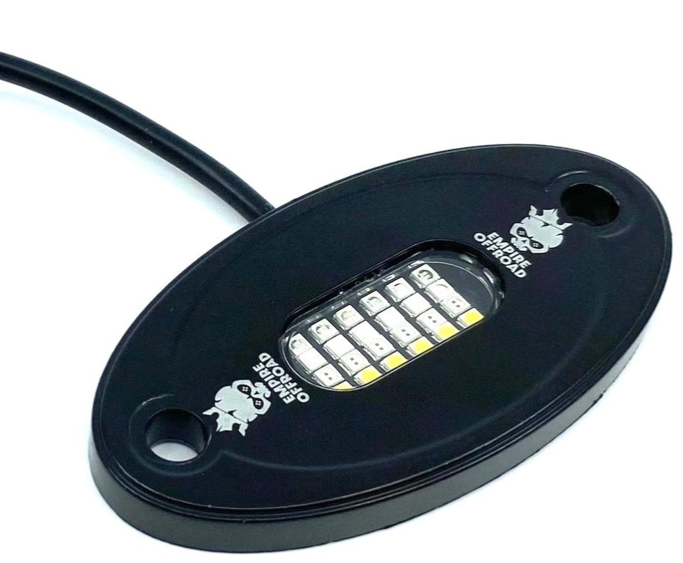Our Highland Series RGB+W Rock Lights don't play around! Each individual Rock Light pod has 24 individual LED's with an Empire Offroad IP68 aluminum indestructible housing case! Highland Rock Light Kits are sold as a standard kit or a modular kit. Standard kits have wire that run each rock light back to the main splitter at the control box. The modular kits are where the fun begins! no more bundles of wire under the hood. These kits have multiple breakout points that let you split and run as you see fit an create a breakout point at every rock light so future add on's can be made without rewiring the whole system. standard wiring diagrams are provided on our downloads page but with the power of modularity you get to customize your installation however you want.