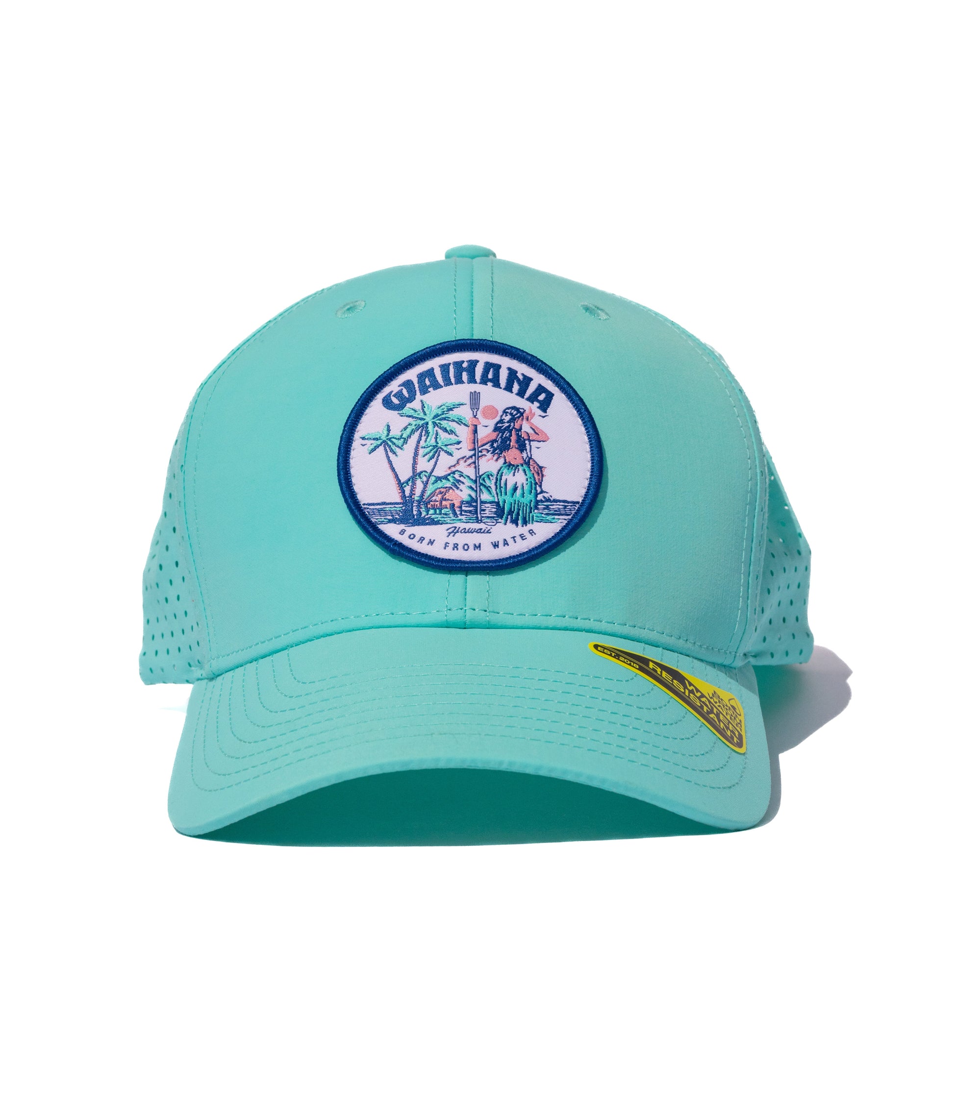 Stay cool and stylish with the Hula Diver Hydro Hat. Made with water resistant performance fabric, this fresh teal color hat features our hula diver design on a woven patch and laser perforated mesh for ventilation and comfort on hot summer days.