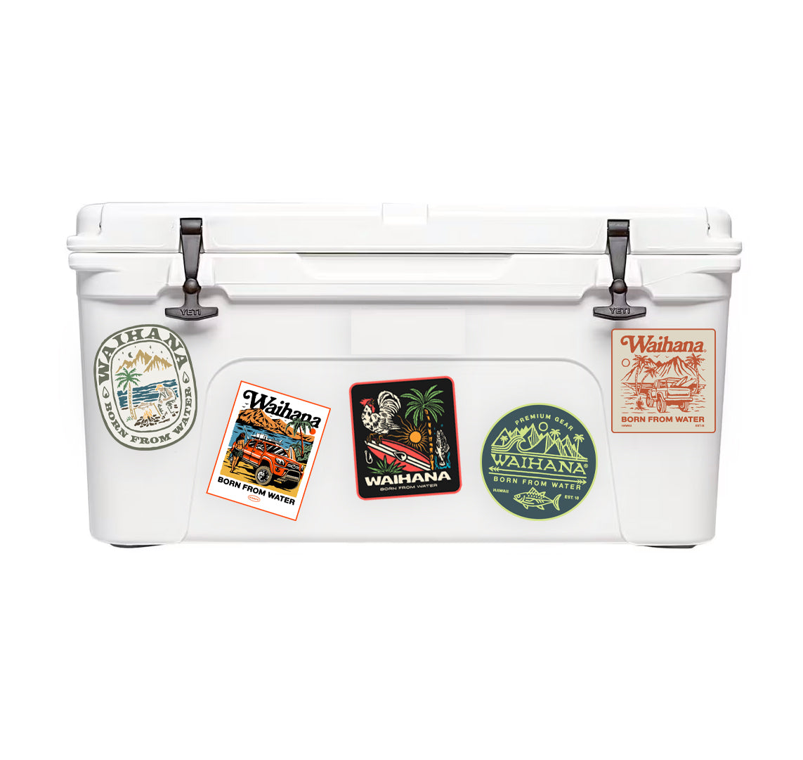 Set of 5 WAIHANA Islands Edition vinyl stickers. Size 3" X 4". Perfect for adding a touch of flare to your vehicle, fins, cooler, or water bottle.