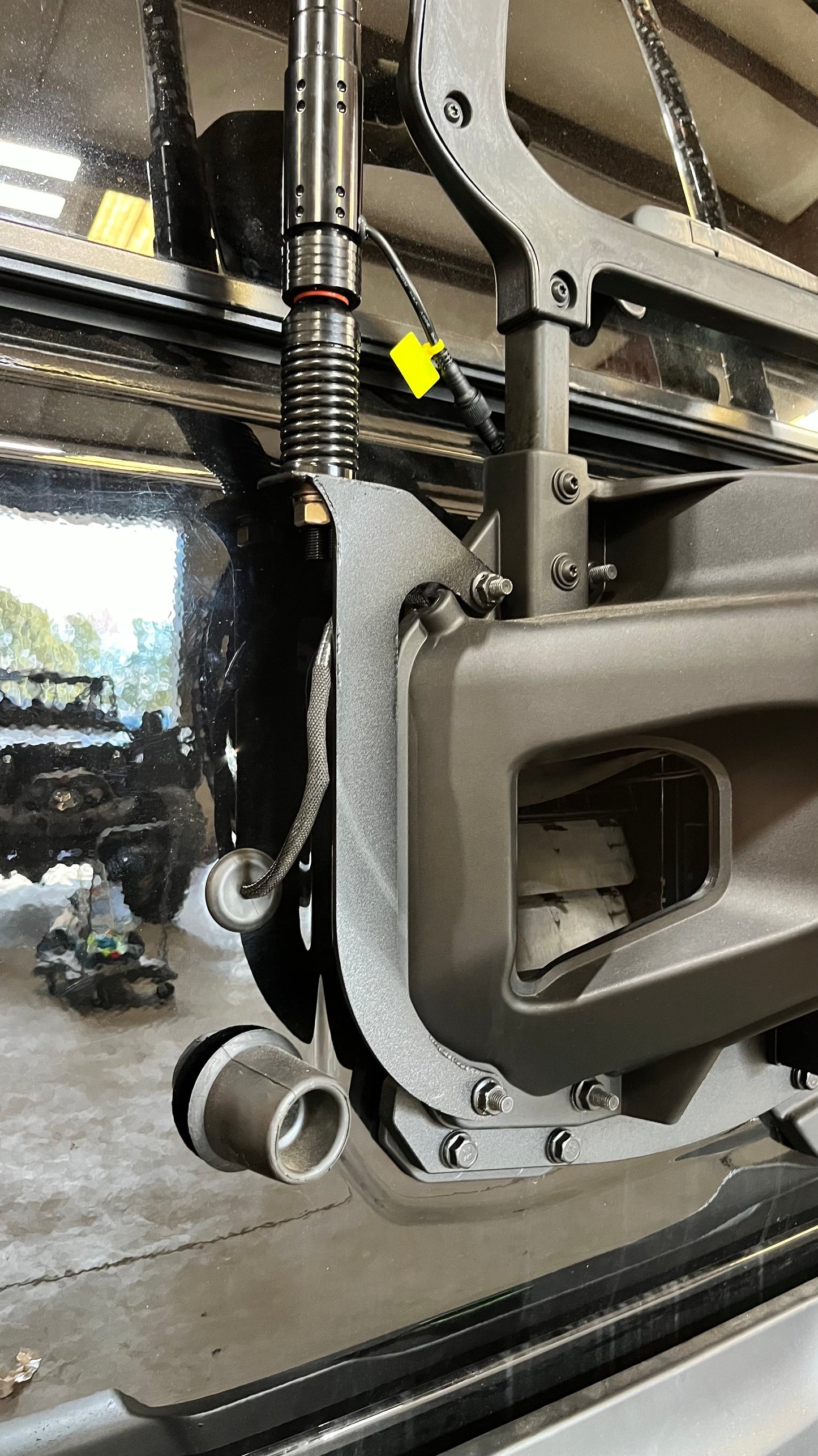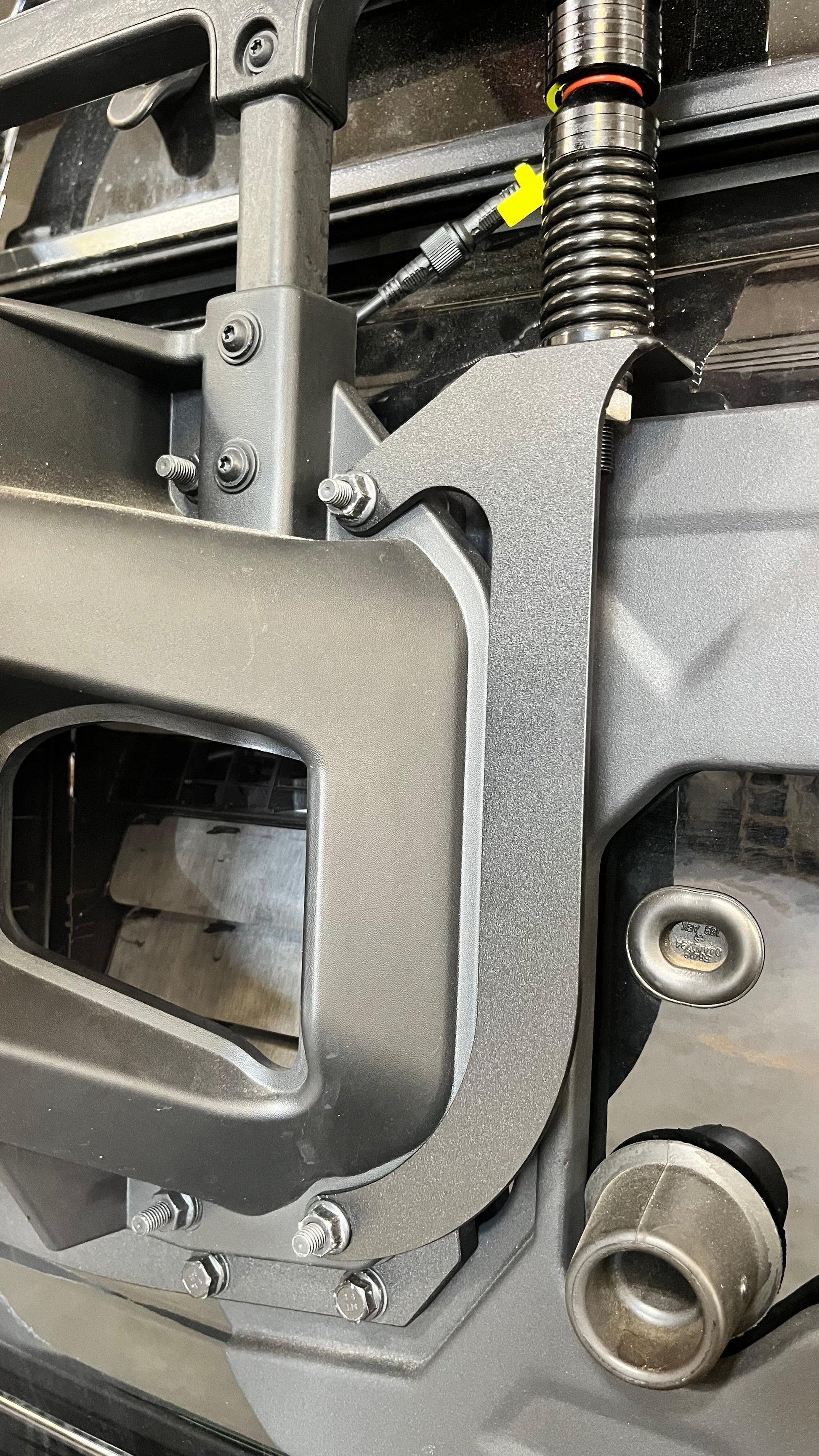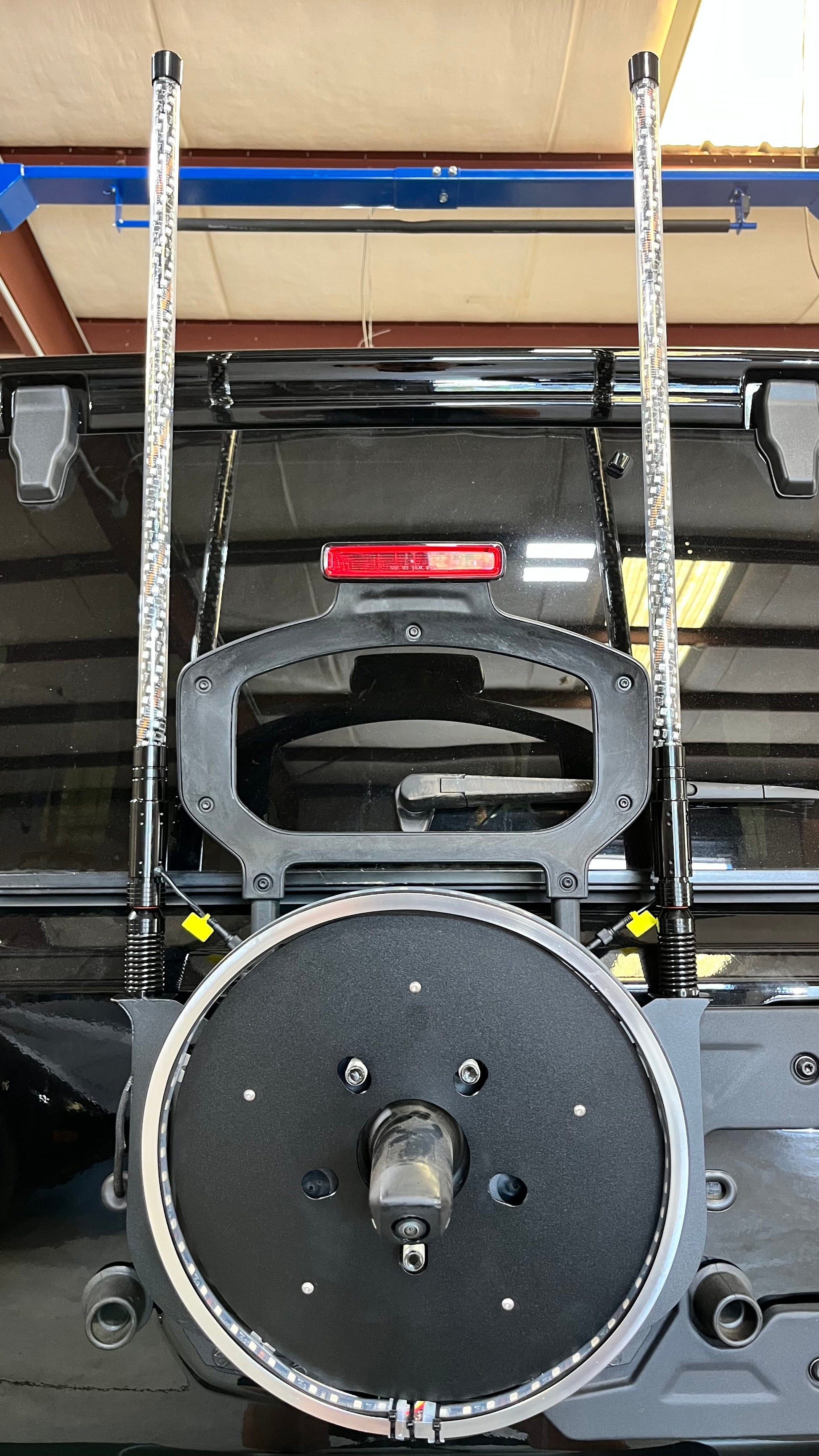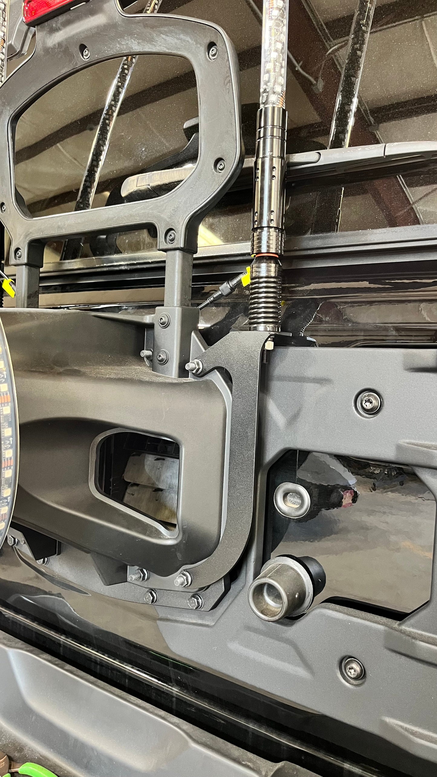 These are not your thin Amazon whip brackets that snap crackle and bend. We took 1/4in Steel and put together a whip bracket that bolts on to the back of your stock tire carrier and allows a strong hold for your whips.