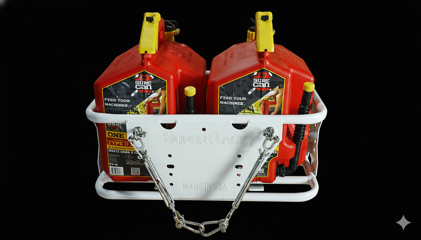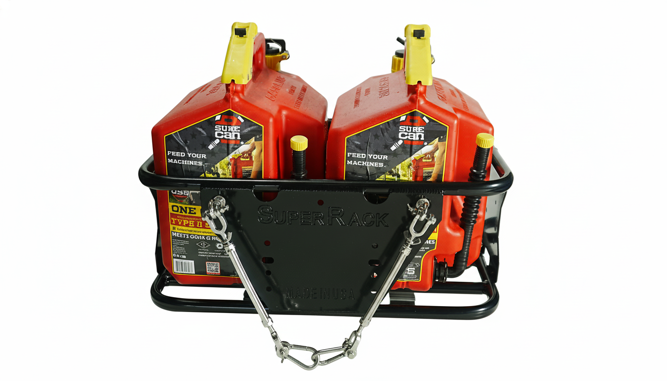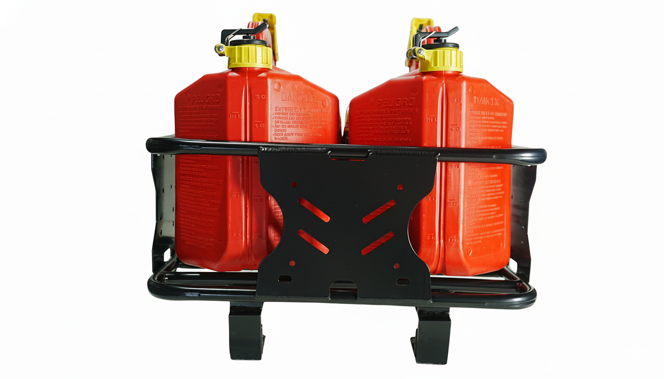 This double rack offers unmatched versatility, allowing you to transport a cooler, two 5-gallon gas tanks, or a combination of one 5-gallon gas tank and a soft cooler, among other configurations.
