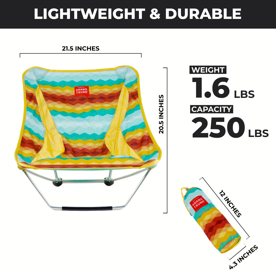 The Grand Trunk Mayfly incline festival chair is the perfect low ground chair for those looking for a low profile, incline chair for use lounging and hanging out. Perfect for use on hills at festival, concerts or the beach. The Mayfly packs small for easy packing on planes, carry-on luggage or small backpacks. Our customer love the ability to take off the front leg section and support yourself with just the back leges and your own feet. No other low ground camp chair boats the versatility of our Mayfly low incline chair.