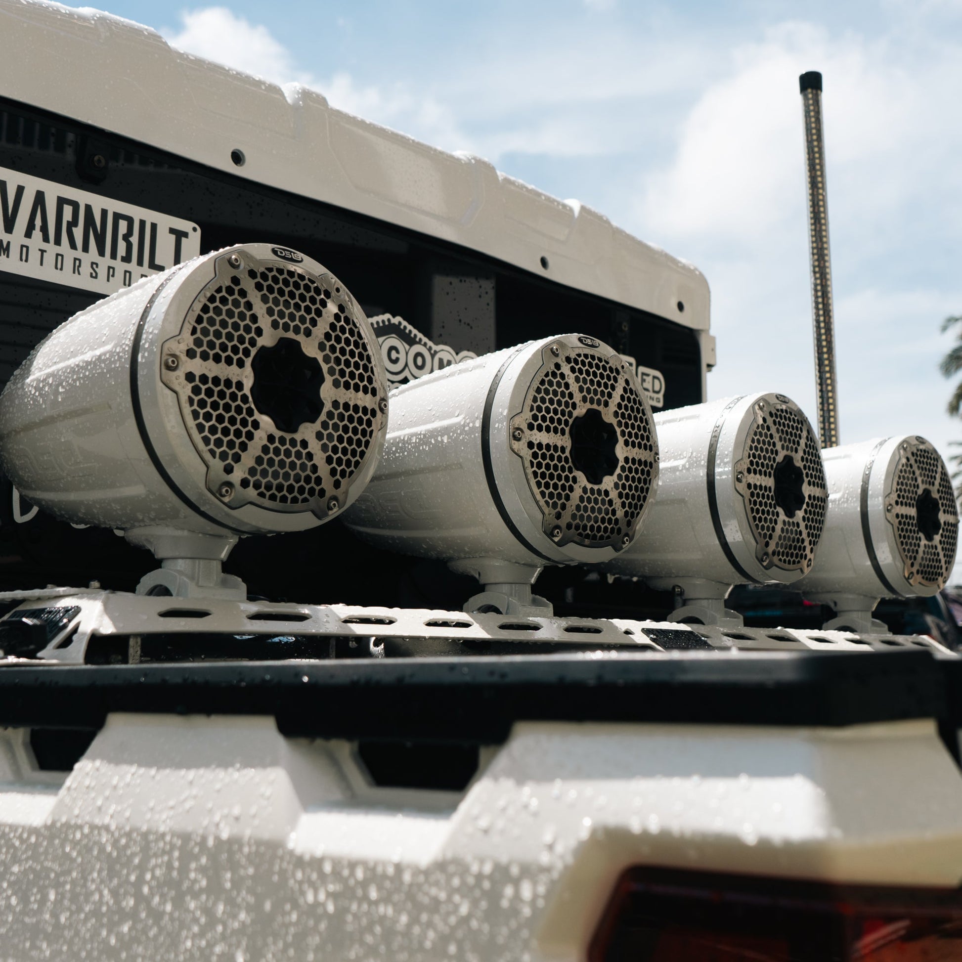New redesigned tower speaker to handle more vibration, abuse, and be overall louder. These models have a new and redesigned clamping system that is much stronger overall than the previous model and has been heavily enforced. We have also added a passive woofer radiator for even more volume and produce more bass. Also included are brightly led lights on the speaker, rings, and passive woofer radiator to brightly light up the night.