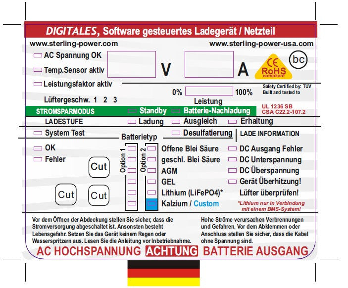Synchronized Rectification The Pro Charge Ultra housing was designed by a renowned American product designer. In the foreground stands optimal function and clean lines. The housing is made of plastic and the back is made of well protected metal plate with the latest corrosion coatings, all other metal fixtures and fittings are stainless steel or non ferrous. |