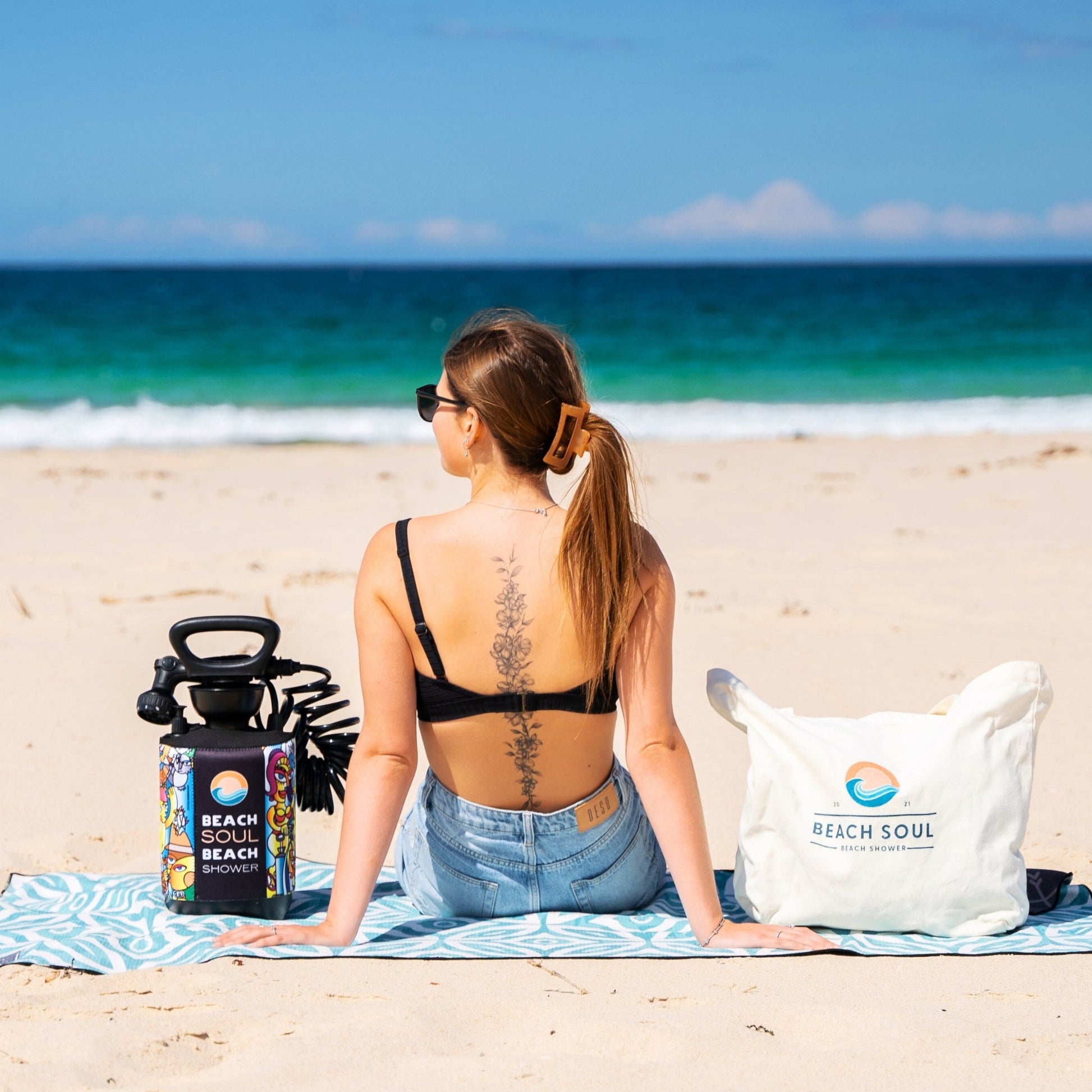 Enjoy the Outdoors with Total Shower Freedom: This fun-sized, art-covered, rinse-ready shower is built for beach hangs, sandy feet, & spontaneous getaways — with bold color & creative flair on tap.