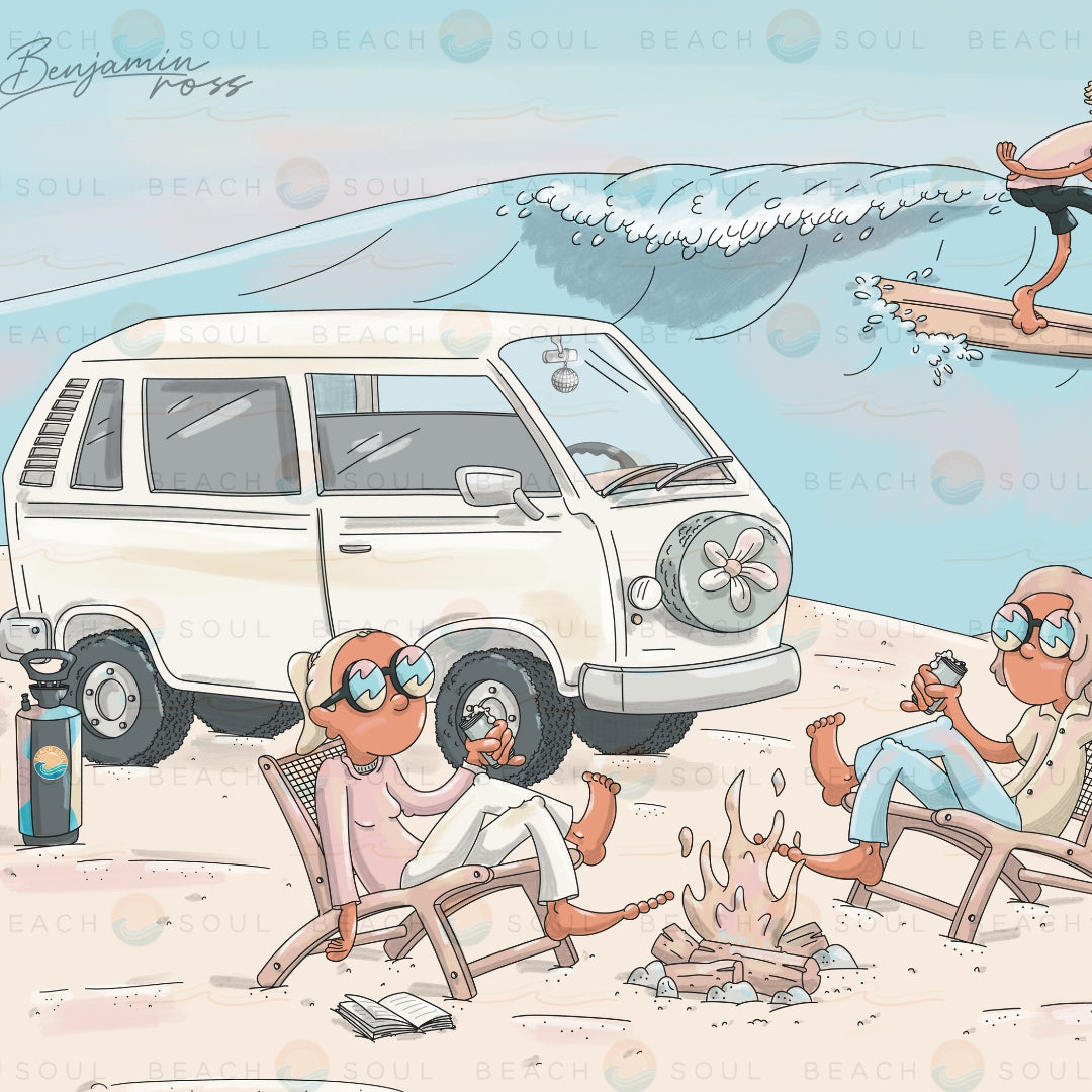 Wrapped in eco-friendly REPREVE® fabric, the sleeve features custom artwork by artist Benjamin Ross — a pastel-toned design full of movement, warmth, and surf-side nostalgia.