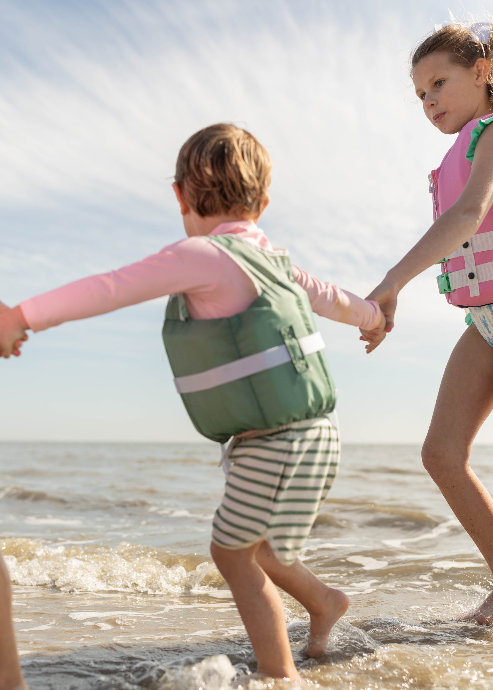 The Skiff can ONLY be put on with the child’s arms through the arm holes and always secure the between the legs strap to reduce the risk of serious injury or death.