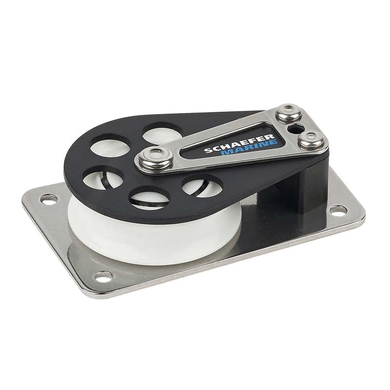 5 Series Cheek Block with Anodized Aluminum cheek and Delrin(tm) ball bearing sheave. Delrin(tm) ball bearing sheave provides low-friction and high safe working load. Stainless steel base distributes loads to a large surface area. Sheave Dia. 2" (51 mm), Max Line 7/16" (11 mm), L 3-5/8" (92 mm), W 2-7/32" (57 mm), H 7/8" (22 mm), Fasteners (4) #10 RH (5 mm), C/C 3" (76 mm), SWL 1500 lbs. (680 kg), Weight Alum. 5.9 oz. (167g), Max Line 7/16" (11mm)