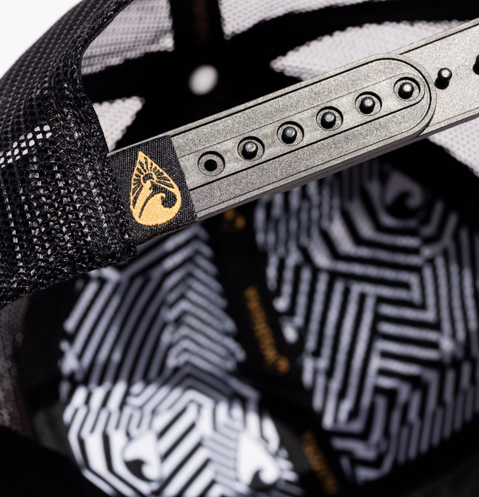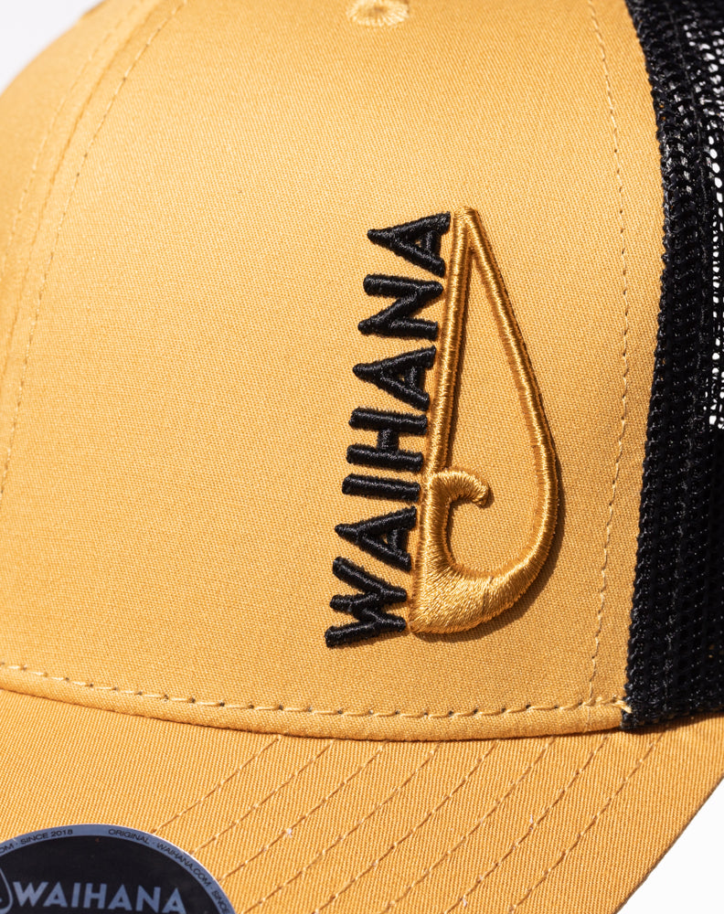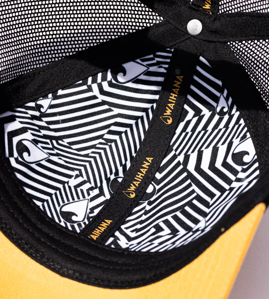 Indulge in the luxury of our Sunset Beach Trucker. Made with 100% cotton fabric on the crown, this stylish cap uses black mesh in the back and features our embroidered Waihana split logo on the crown. Elevate your look with this exclusive and sophisticated hat.