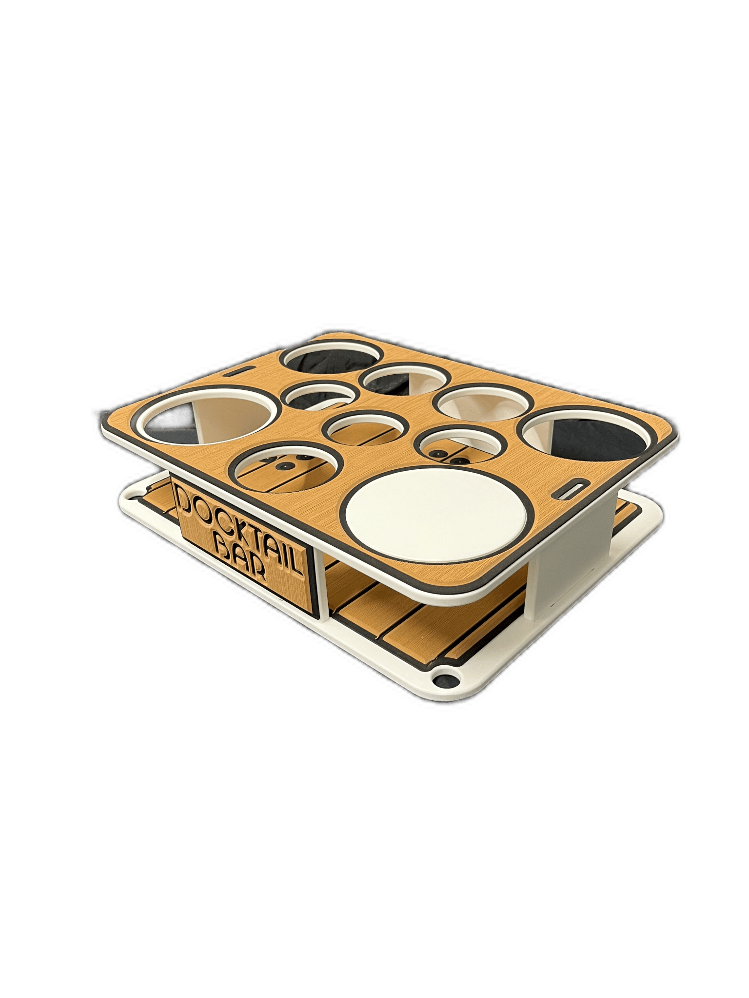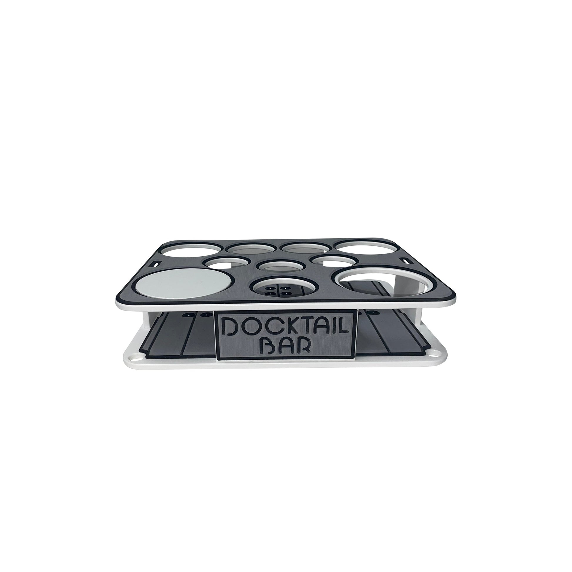 - Combines the Docktail Table Caddy with our custom fit Docktail Bar Bait / Serving table. Simply attach the rod holder mount to the bait / serving table base and the bar top then slides and locks in place.