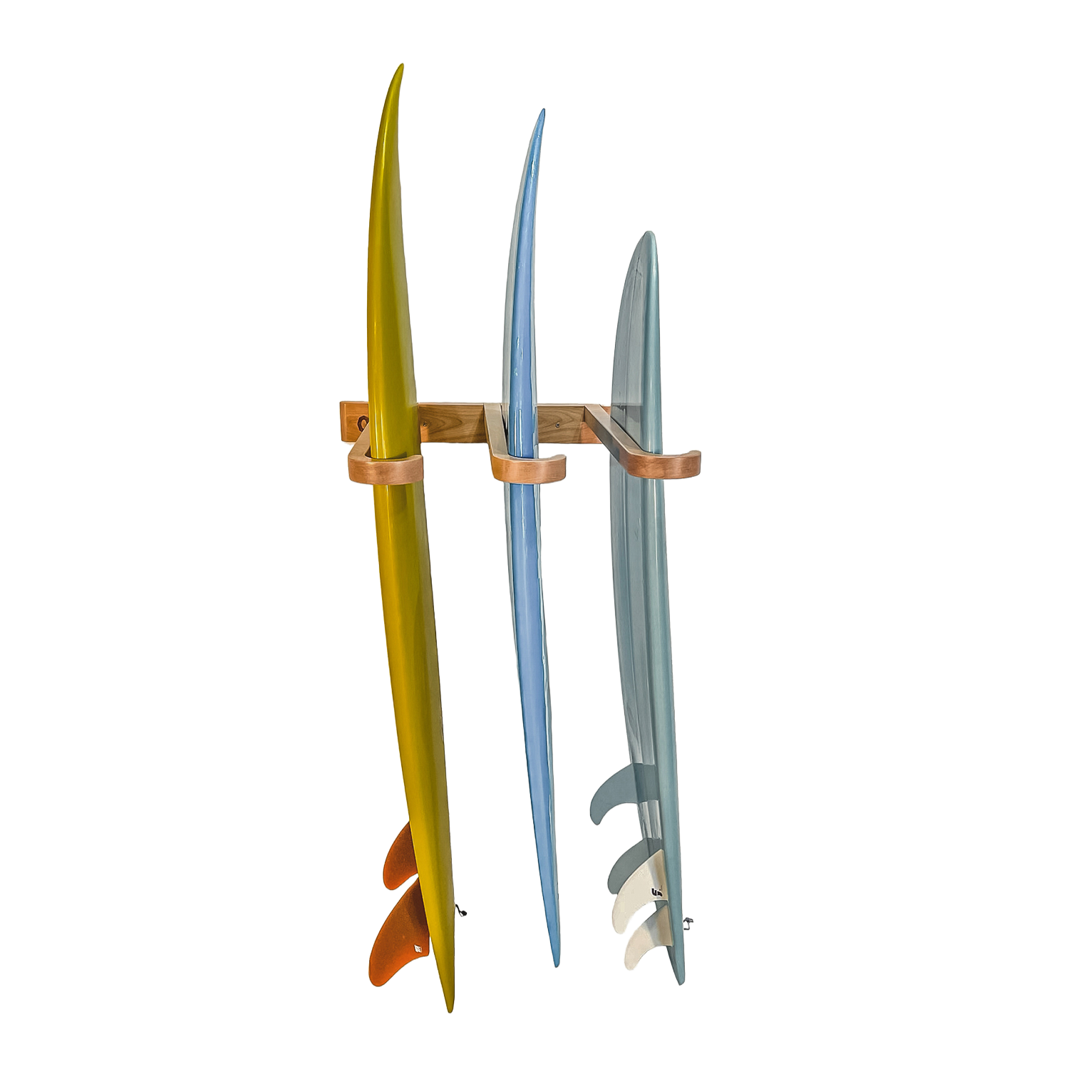 Designed by our friend Zach Crawford, this modular surfboard rack system hold 3 boards. More board? No problem... they stack perfectly along the wall of your garage or home office.