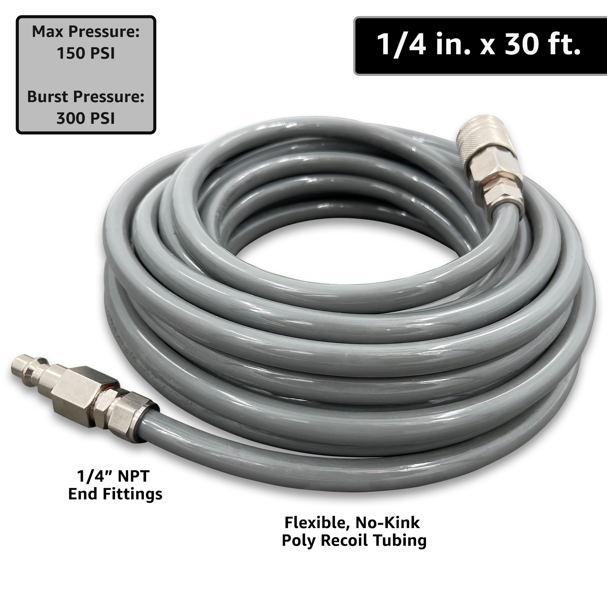 - EASY-TO-USE - using an air hose shouldn't be frustrating. Our poly air hose is easy to move around, and will effortlessly uncoil to any length you need up to 30 feet, and quickly recoil back when the job is done.