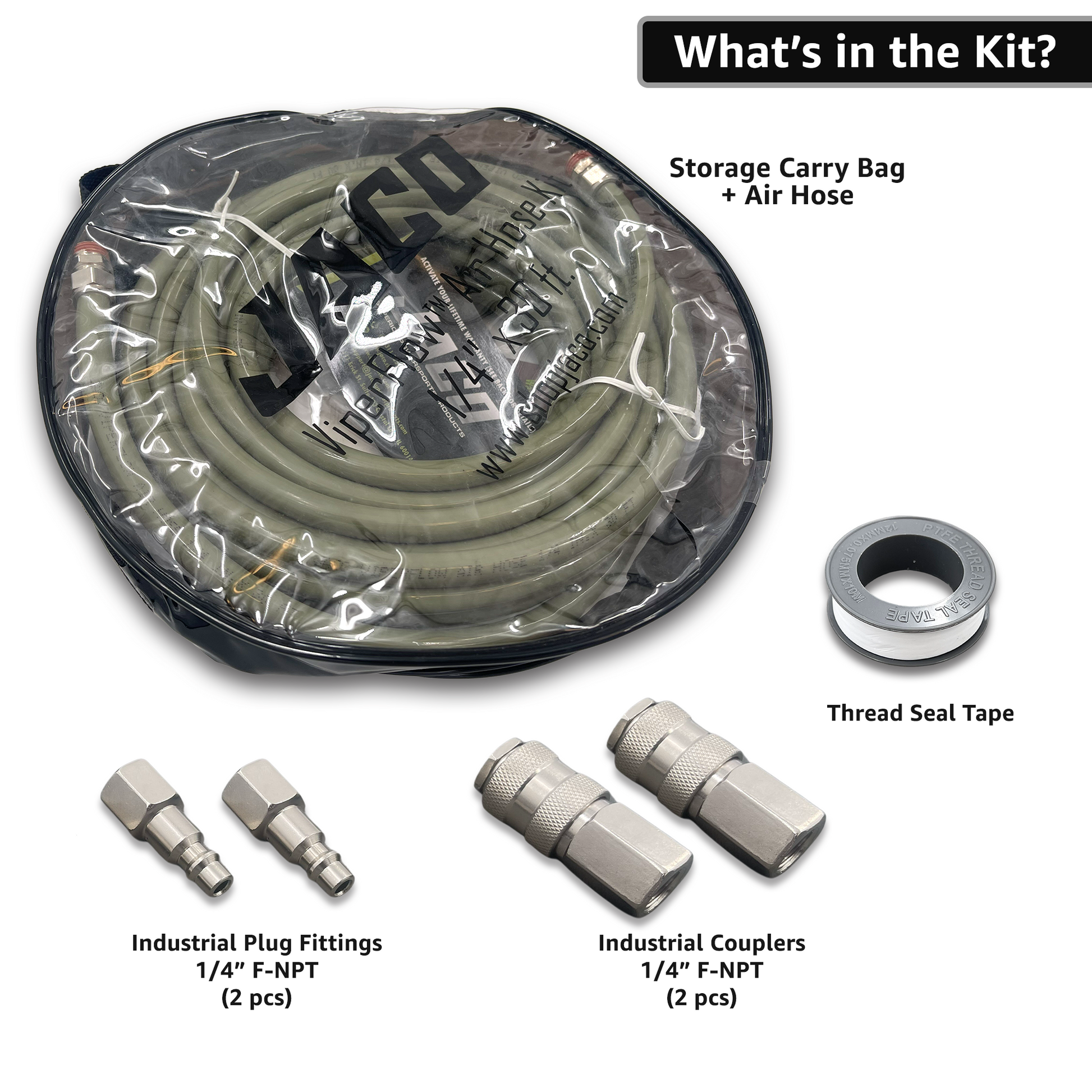 - AIR FITTINGS KIT - rapidly connect the hose to all of your air compressor tools and accessories with our included air fittings kit that includes (2 pcs) Industrial couplers, (2 pcs) Industrial plugs, and thread sealant tape (all included fittings are 1/4 inch F-NPT threaded).
