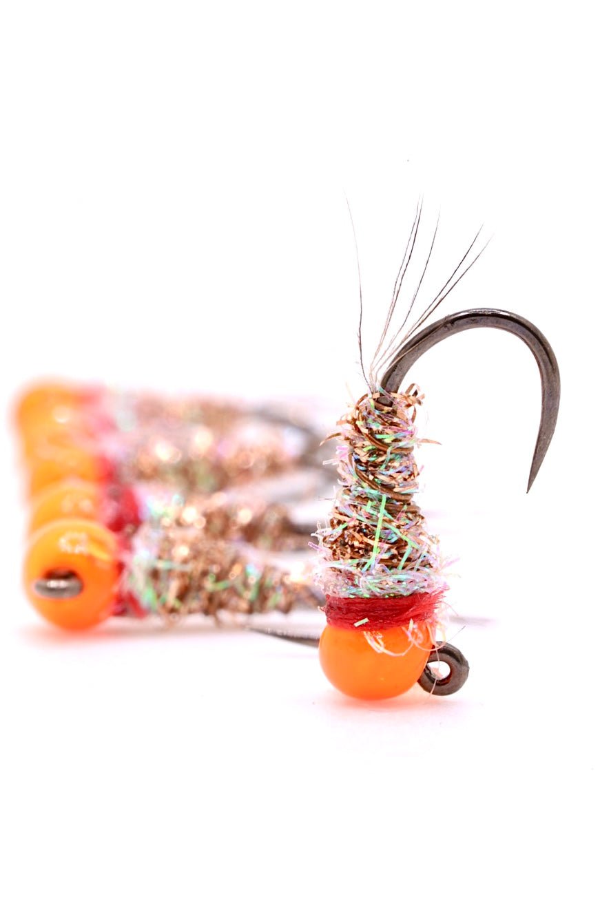 Drops fast with a hot orange tungsten bead. The buggy, high-flash body trigger aggressive eats. A go-to anchor fly for covering water and moving fish.