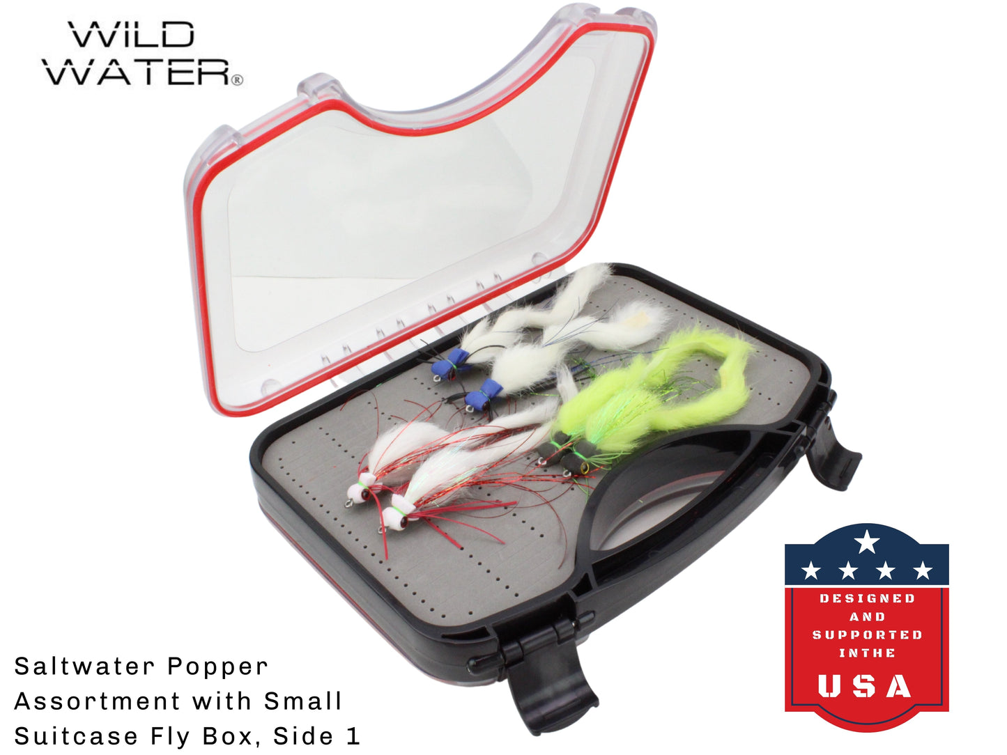 Wild Water's Freshwater/Saltwater Large Foam Popper Assortment with Small Fly Suitcase is sure to be a favorite of any saltwater angler. Our Small Fly Suitcase will come loaded with 12 flies in a variety of colors and patterns. Best suited for Pike, Stripers, Red Fish, Tarpon, Bass.